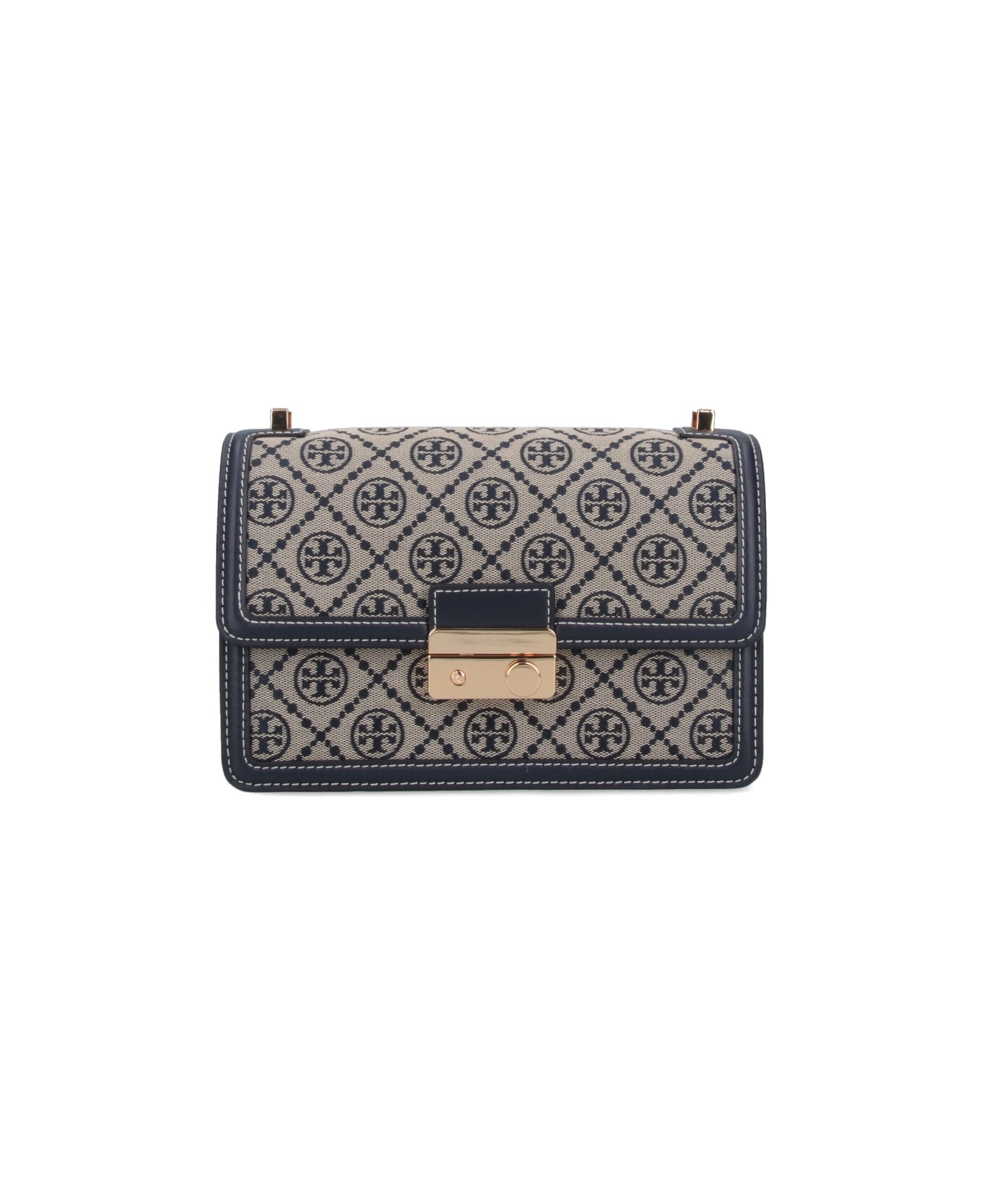 Tory Burch 'T Monogram' shoulder bag in beige cotton blend with leather trim, blue jacquard logo pattern, adjustable and removable shoulder strap, snap buckle flap closure, inner flat pocket, inner zip coin pocket, two separate inner compartments.