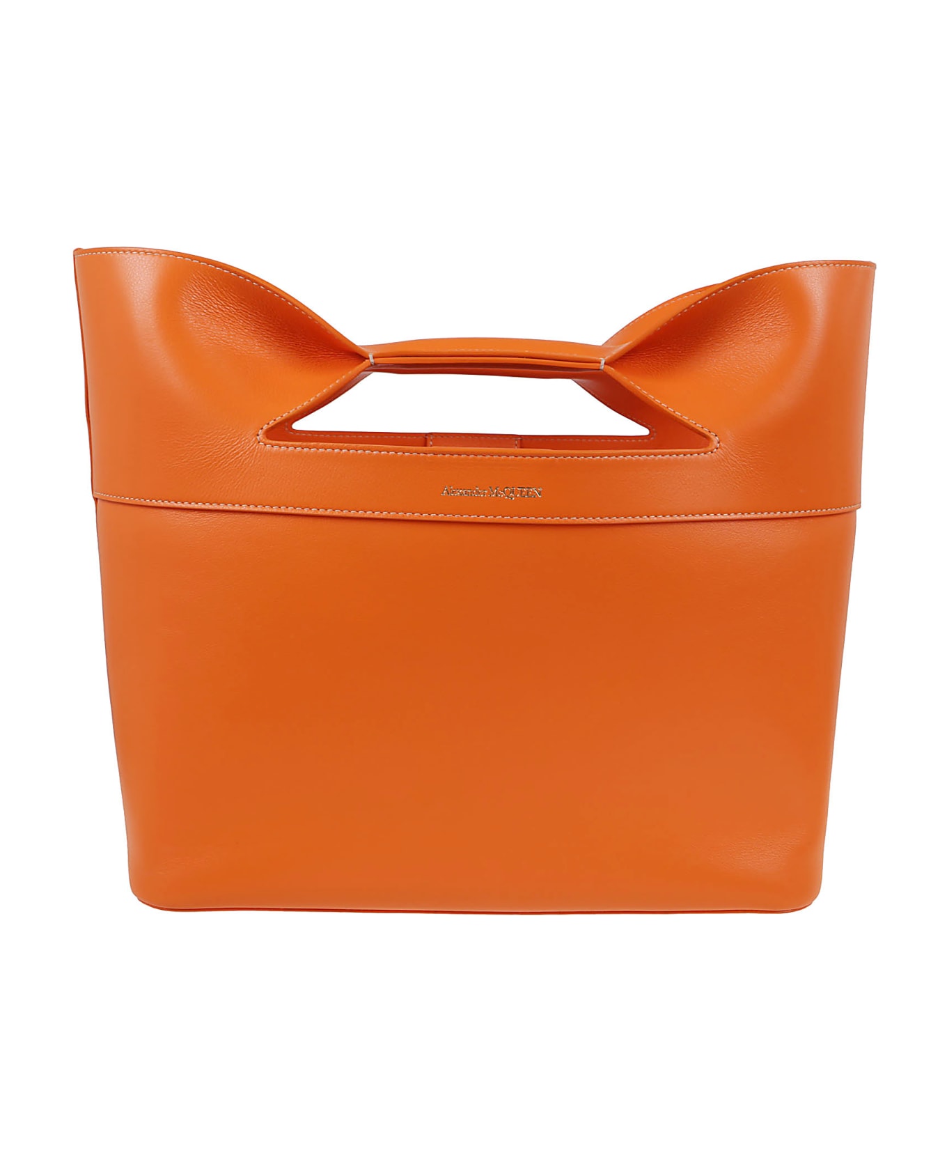 The BOW SMALL in calfskin BY ALEXANDER MCQUEEN. One main compartment, inside removable zip pouch with external card slot; magnetic closure. Twisted top handle. It can be carried both by hand and on the shoulder thanks to the internal shoulder strap.