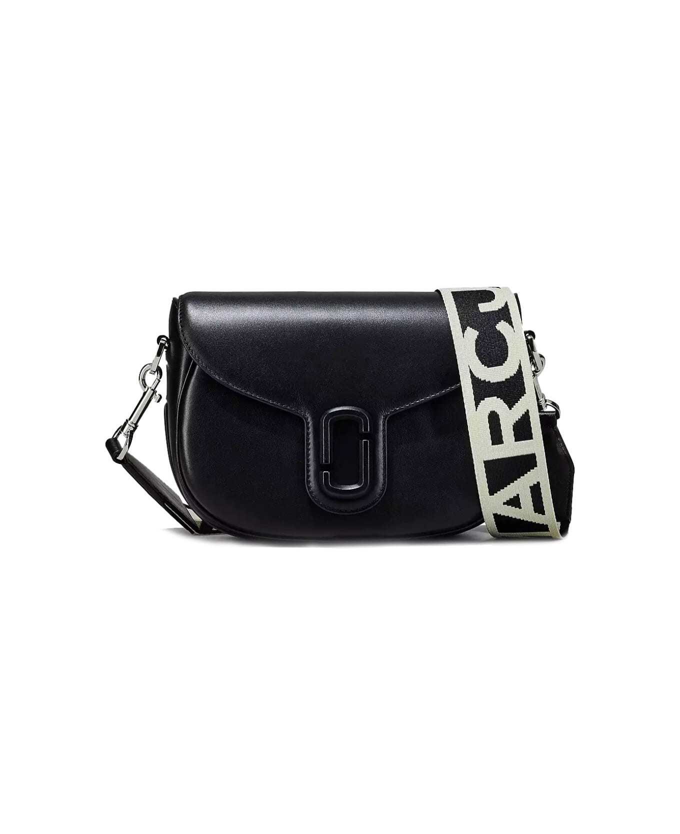 The J Marc Saddle bag by Marc Jacobs made of black leather, embellished with silver metal details and tone-on-tone front logo. Magnetic closure, lined interior with zipped slip pocket. Shoulder strap in logoed fabric, adjustable and removable. Measures 27x8x18 cm.