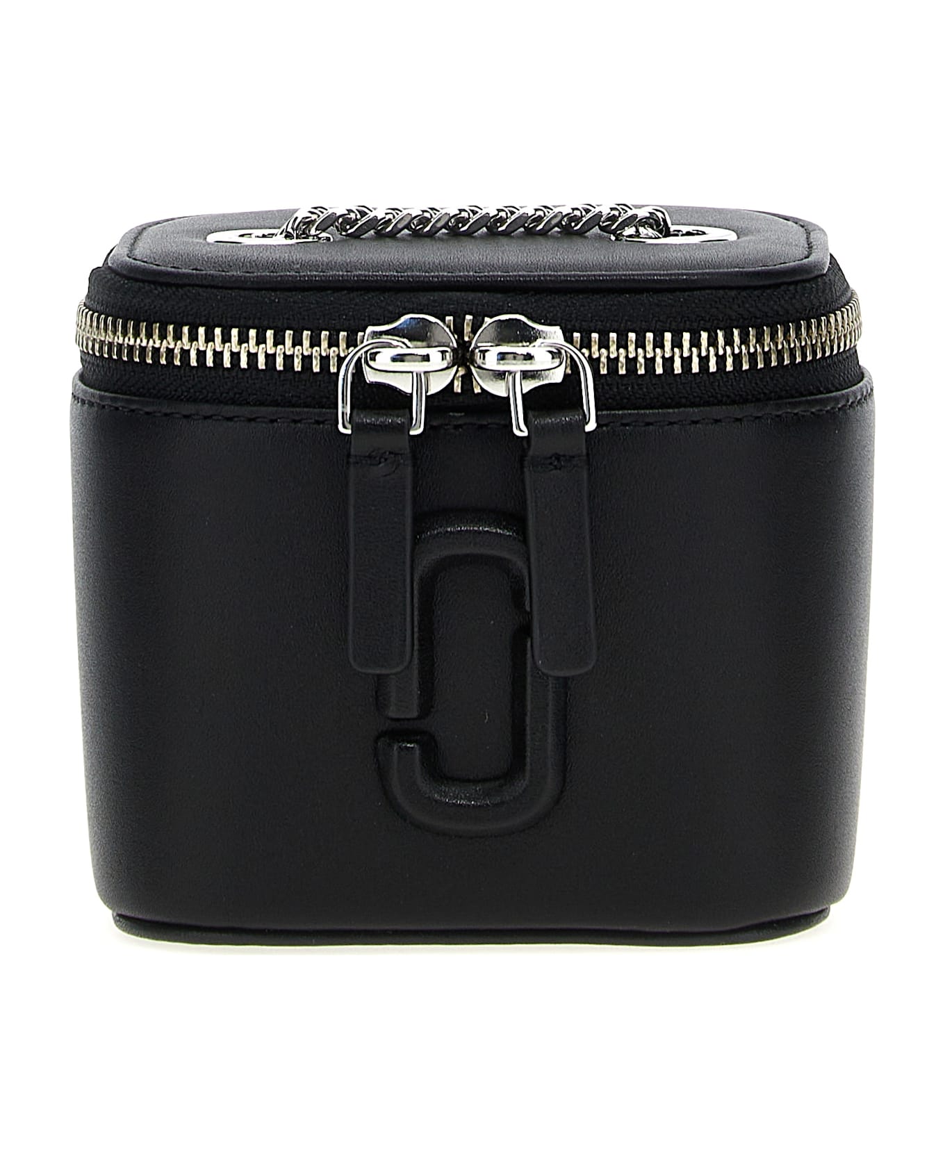 'The Mini Vanity' smooth leather crossbody bag, zip closure, tone-on-tone metal logo on the front, sliding chain shoulder strap.