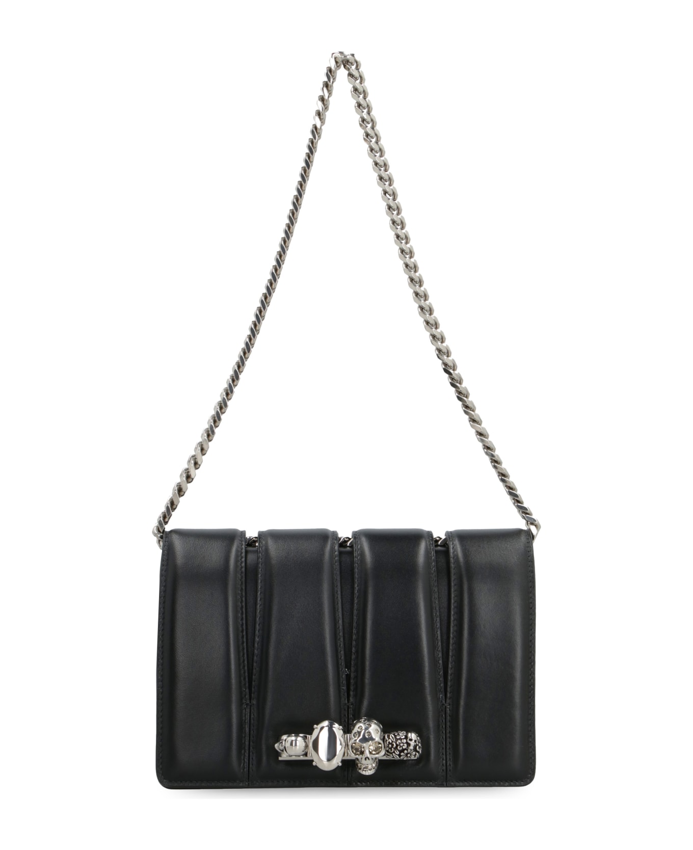 Calf leather item Swarovski crystals four rings detail Cut out details Closure with flap and press fasteners Internal flat pocket One card slot Chain shoulder strap Silver-tone metal hardware Leather lining Width: 23 cm Height: 16 cm Depth: 7 cm Strap: 60 cm 70% Calf, 30% Lamb