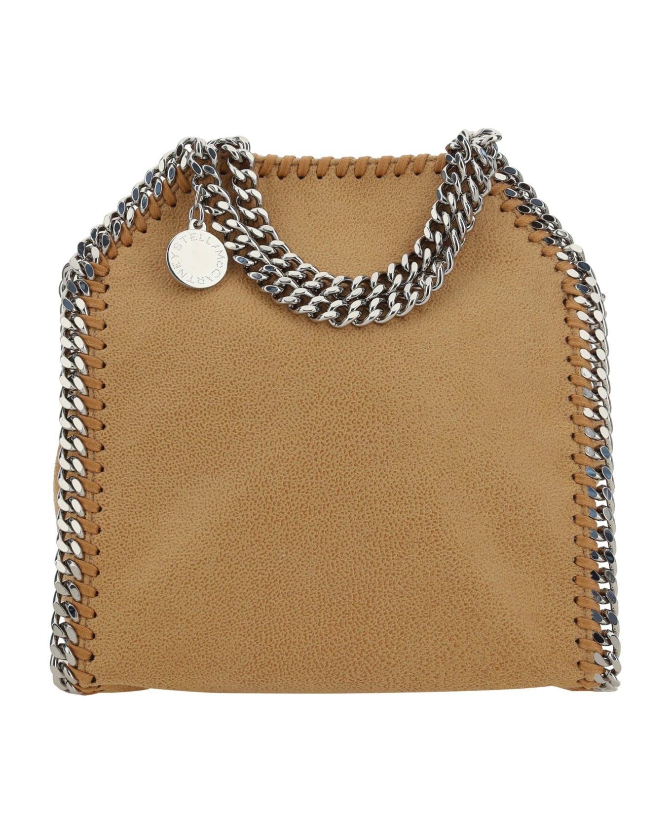 Tiny tote shoulder bag by stella mccartney, silver-plated chain trim and top strap, suede-effect faux leather design, soft design, single interior compartment, iconic metal brand signature charm applied to base of shoulder strap.
