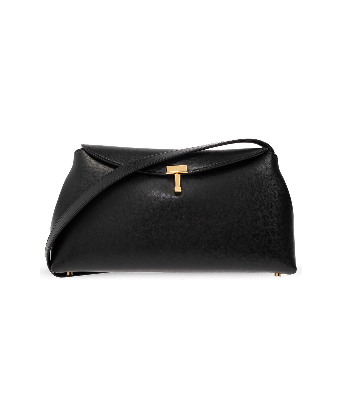 Black shoulder bag from Toteme. Made of leather, this design features a flap with a twist closure, detachable and adjustable shoulder strap, gold-tone metal hardware and one internal compartment with one card slot.