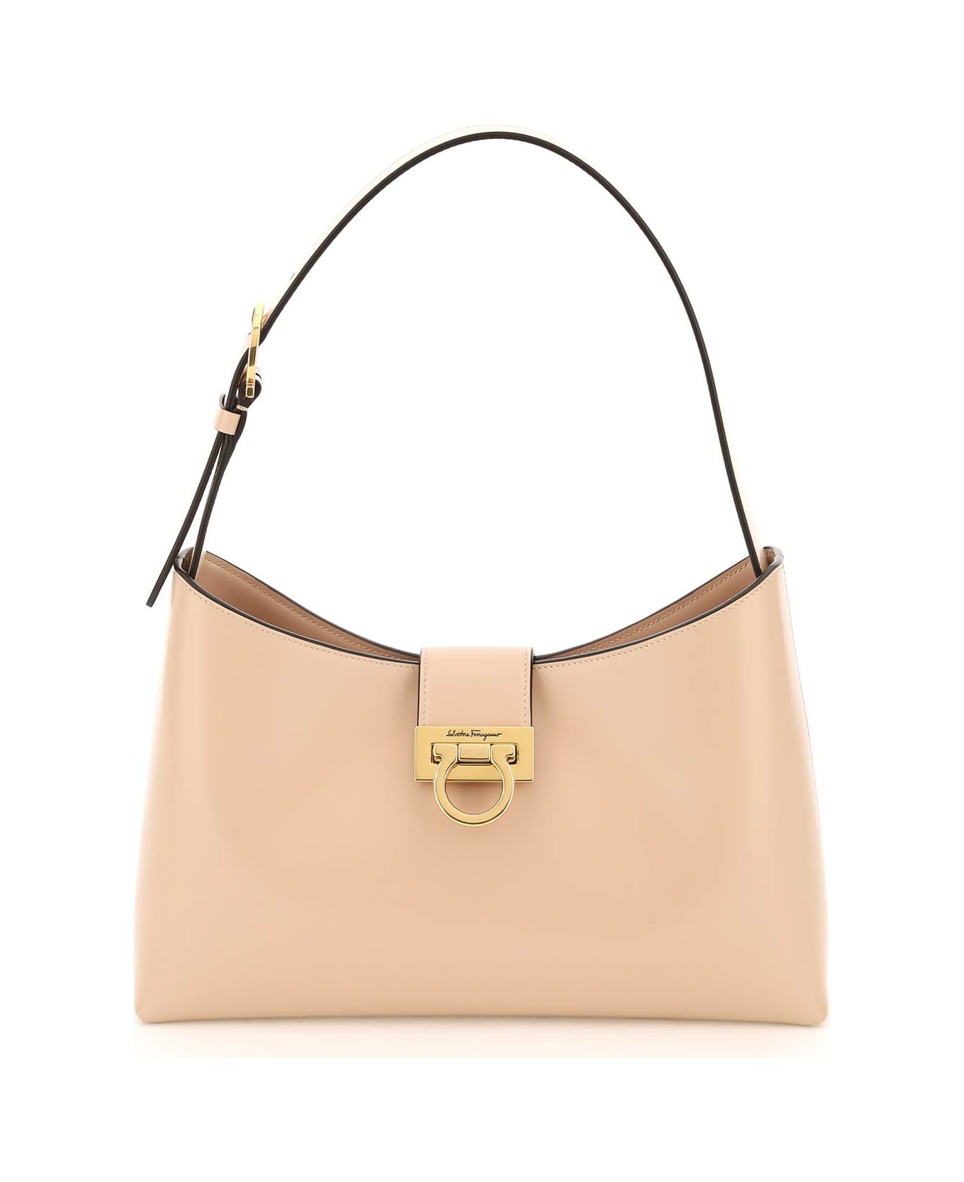 Trifolio shoulder bag by Salvatore Ferragamo crafted in matte leather featuring bridge closure with Gancini clip and adjustable top handle with Gancini buckle. Leather interior with an open flat pocket, two compartments and a middle zipped flat pocket. Gold-finished metalware. Composition: 100% pelle di vitello