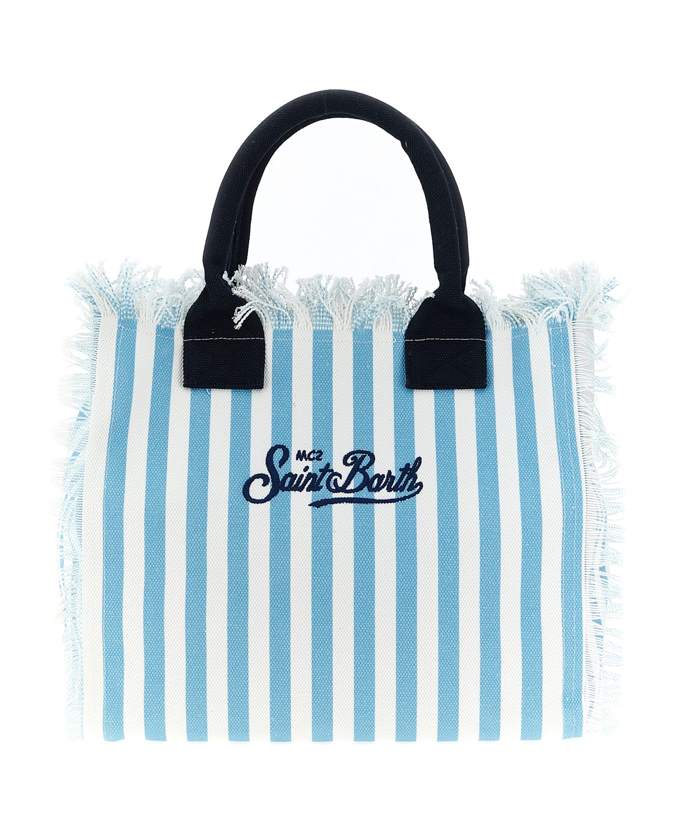 'Vanity' shoulder bag in striped cotton canvas canvas, fringed edges, logo embroidery on the front and back, double fixed handle, top zip closure, cotton lining. Composition: 100% cotton