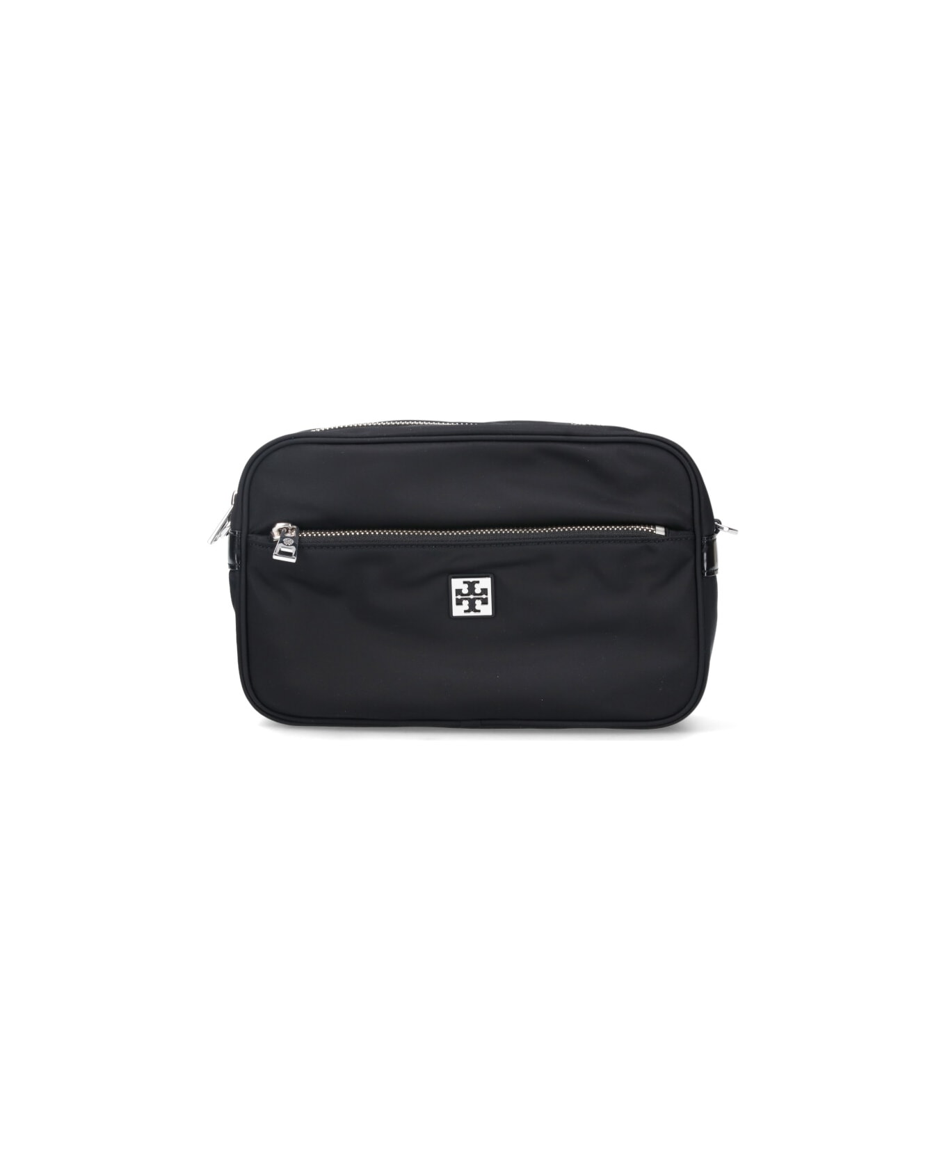 Tory Burch 'Virginia' black fabric crossbody bag with adjustable and removable shoulder strap, zip closure, metal logo on the front, outer front zip pocket, main inner compartment, inner zip pocket.