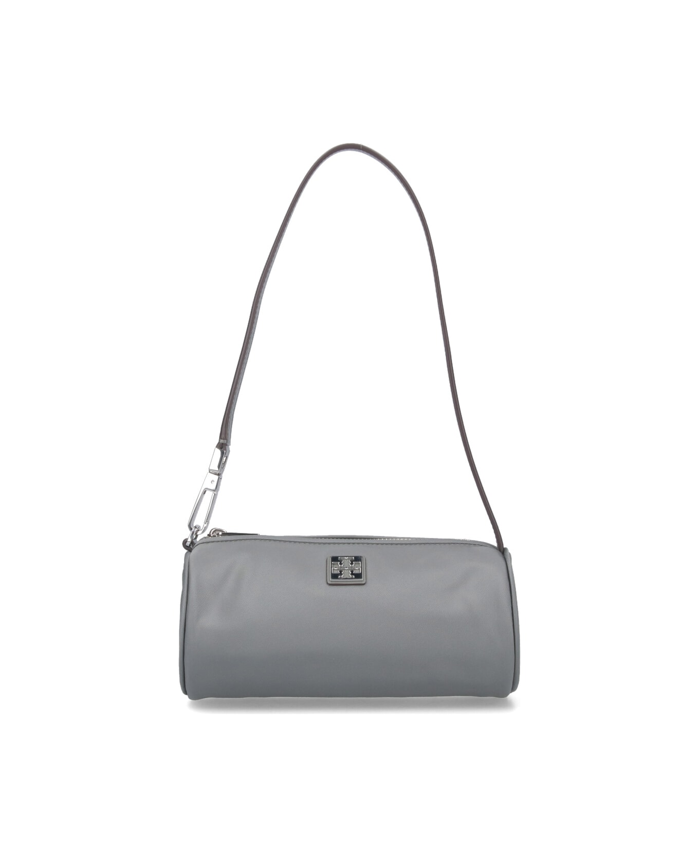 Tory Burch 'Virginia' shoulder bag in grey nylon with adjustable and removable shoulder strap, zip closure, double 'T' logo detail engraved on the front, inner slip pocket, single inner compartment.