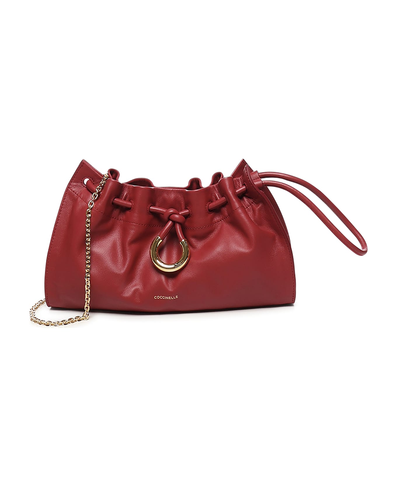 -Magnet closure -Tubular metal detail and knot -Tubular leather sleeve -Adjustable shoulder strap -Gold plating -Logo on the front -Dimensions: 31x15x7 cm -Color: Sangria