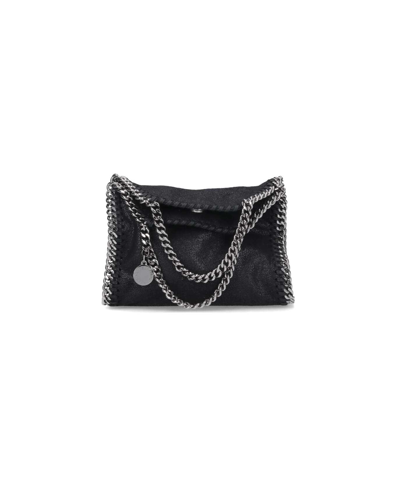 Stella McCartney Falabella micro tote bag, black fabric, two silver metal chain handles, hanging logo charm detail, magnetic closure, one interior flat pocket, one interior single compartment. Composition: 100% Polyester
