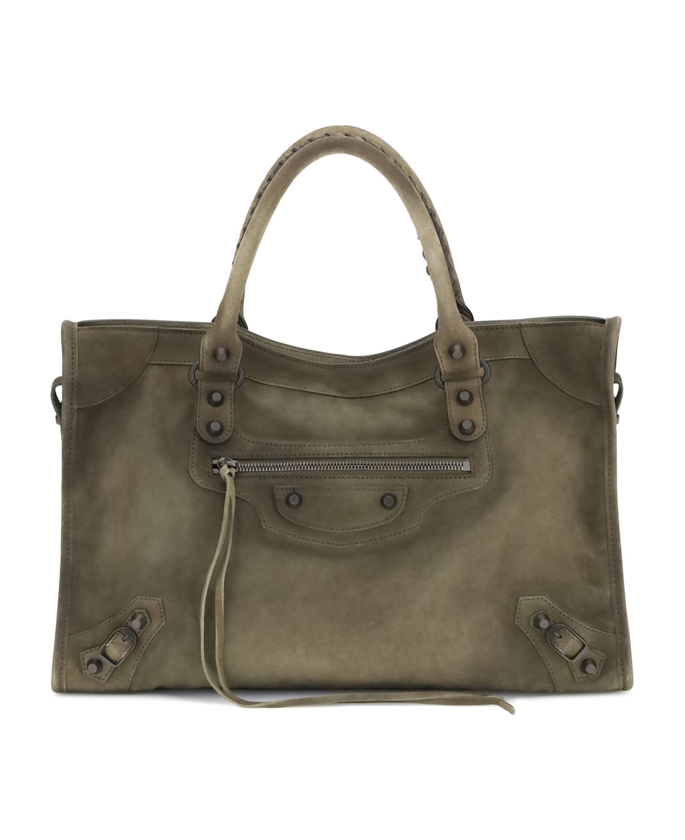 Balenciaga's le city medium handbag, crafted in suede with a waxed effect, embodies elegance with a strong character. featuring two hand-woven leather handles, it has a removable and adjustable shoulder strap for added versatility. brass hardware and knotted leather pulls on both the main closure and front pocket add a handcrafted touch. the interior is completed with a handy zippered pocket, ideal for organizing essentials in style.