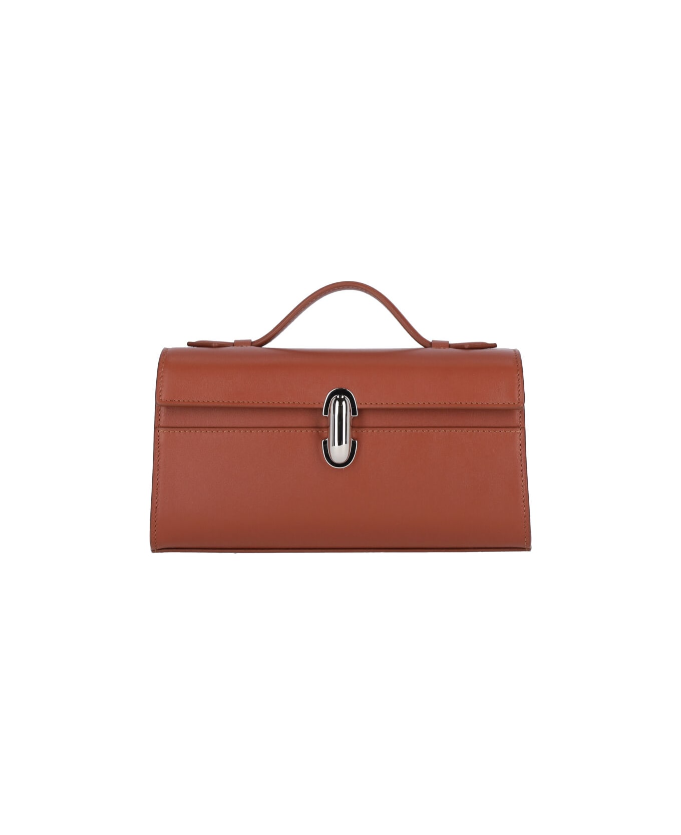 Savette 'Symmetry' brown leather pouch with handle, turn-lock flap closure, inner flat pocket, main inner compartment.