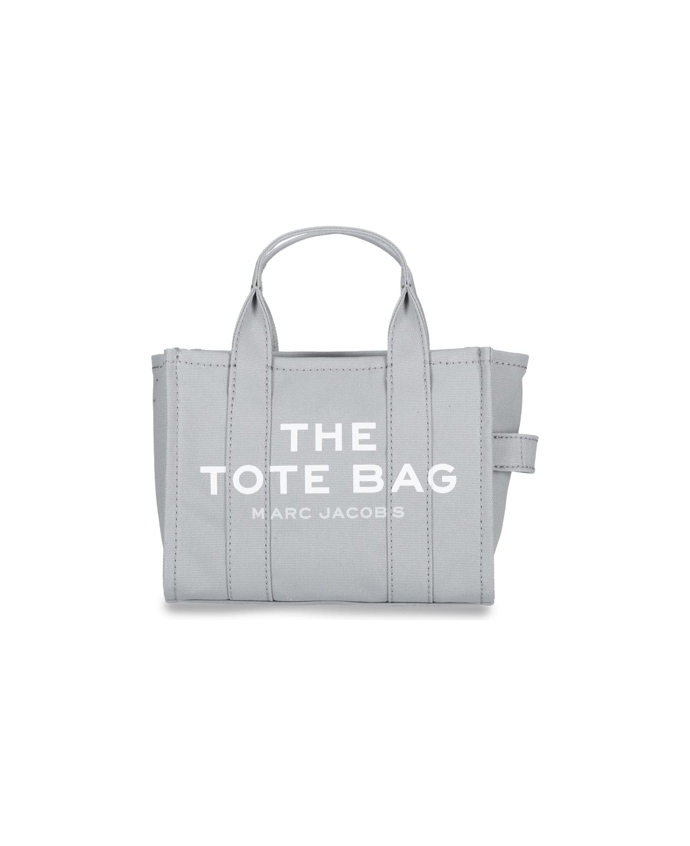 Marc Jacobs The Small Tote bag, in grey cotton, two top handles, adjustable and removable ribbon shoulder strap, white logo print on front, side strap, logo label on back, zip fastening, one internal compartment.
