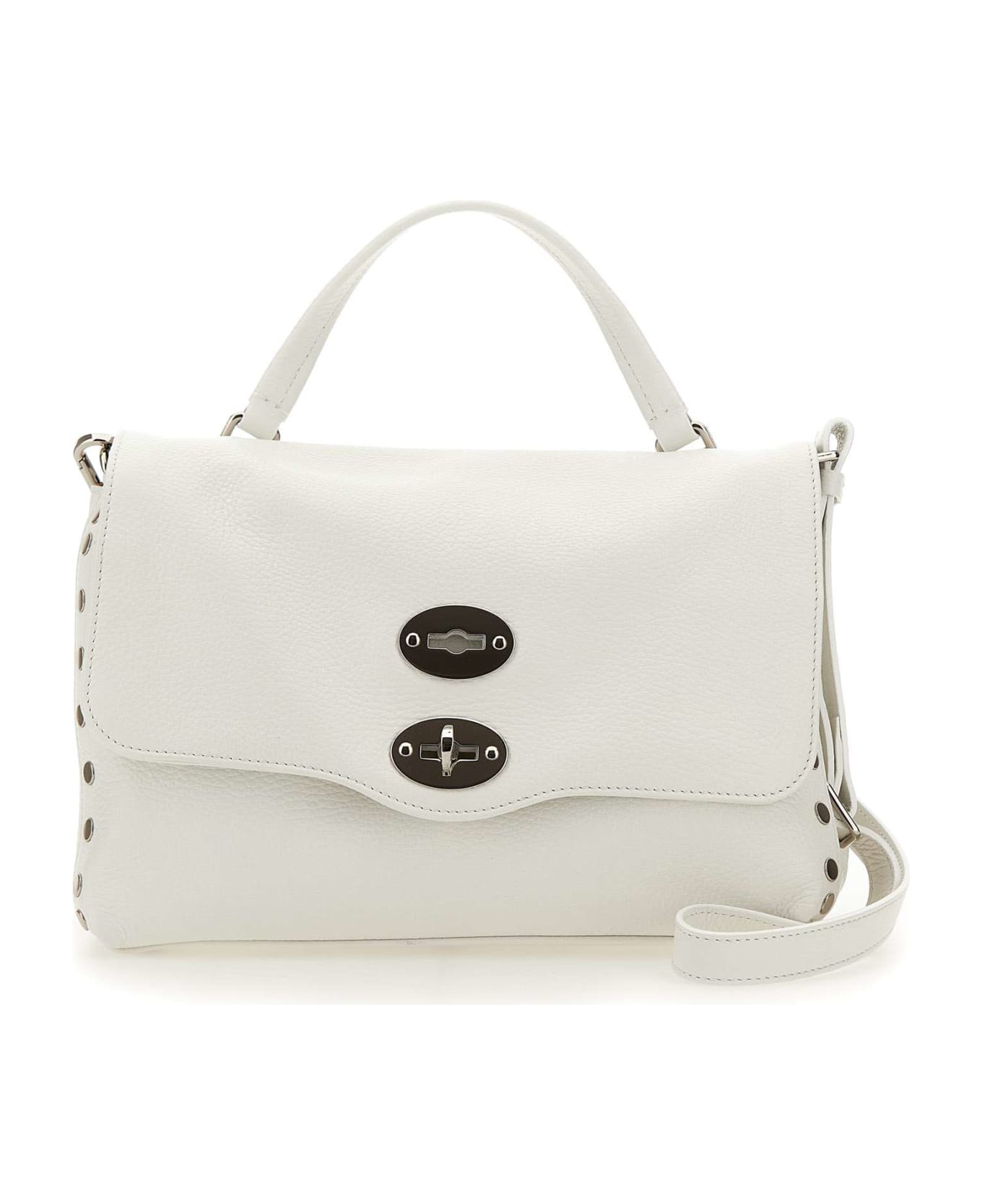 Zanellato "Postina Daily Small" textured leather handbag, white, swivel mechanism fastening, top handle, adjustable shoulder strap, silver metallic finishes, support feet on hem, double internal compartment with zipped pocket, camel-colored lining. Dimensions: depth 13cm, width 30cm, height 19cm, shoulder strap 60cm. Made in Italy.