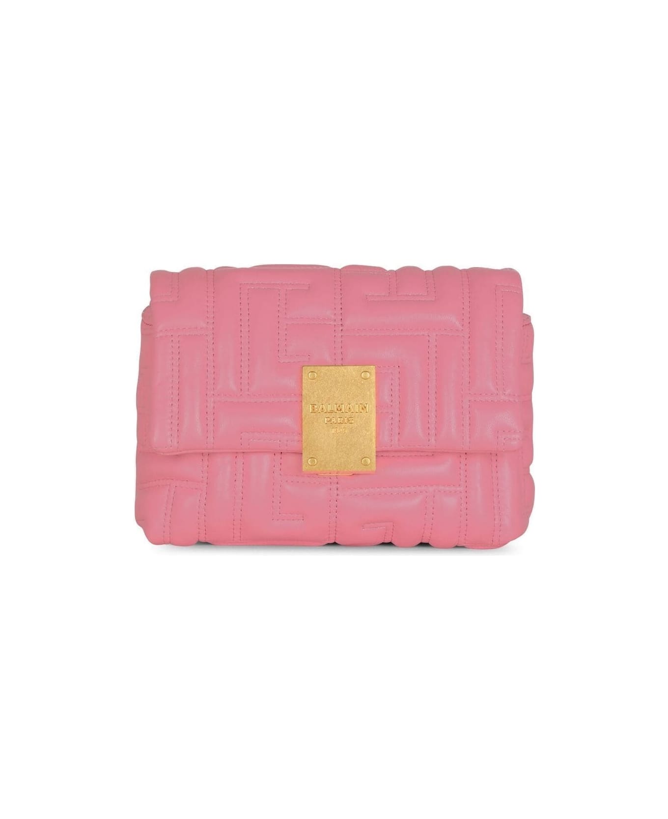1945 Soft mini model bag by Balmain made of pink lambskin with monogram quilting, gold metal details, card pocket and embossed logo on the inside, one braided chain handle with smooth leather and flap with magnetic clip fastening and riveted 'Balmain Paris 1945' plaque.