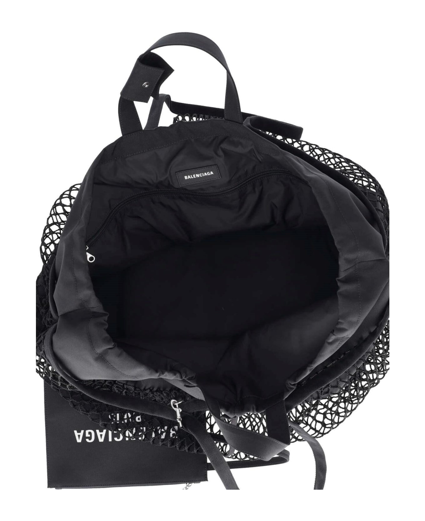 Balenciaga 24/7 large tote bag in black fabric with tonal mesh, two top hand handles, two top shoulder straps, contrast logo print on the front, outer mesh compartment, drawstring closure, main inner compartment, inner zip pocket, removable zip pouch, contrast logo print detail on the front. composition: 70% polyamide, 15% cotton, 15% polyester size and fit: h 39. 8 x w 68 x d 25. 9 cm