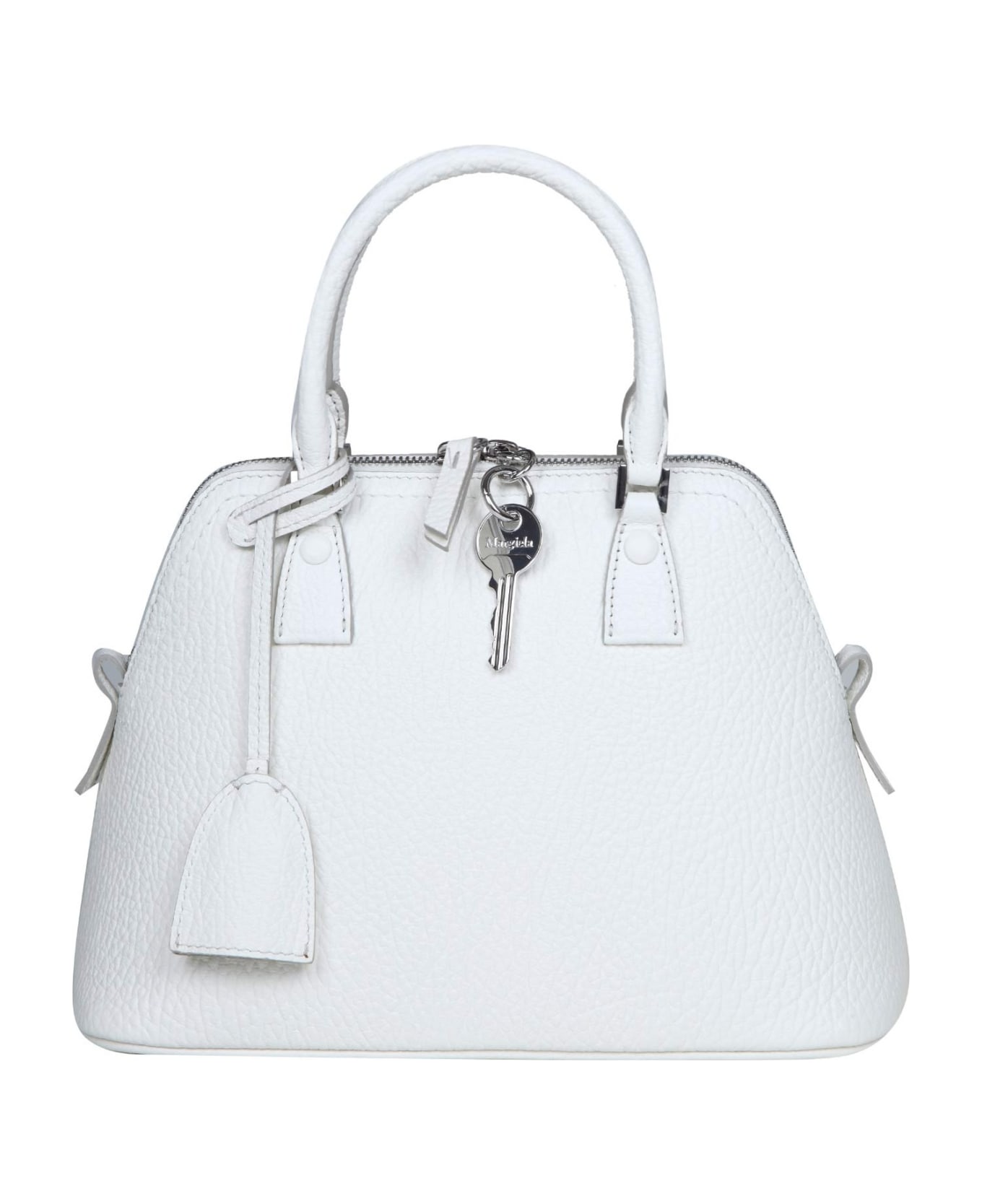 Handbag textured leather and fabric material top closure with metal zip interior lined in canvas maxi maison margiela tag applied at the top small double handles adjustable and removable leather shoulder strap cursor with key removable charm with metal padlock the upper structure in fabric canvas can be stored inside thanks to the second zip closure white color measures: length 26cm depth 26cm height 12cm