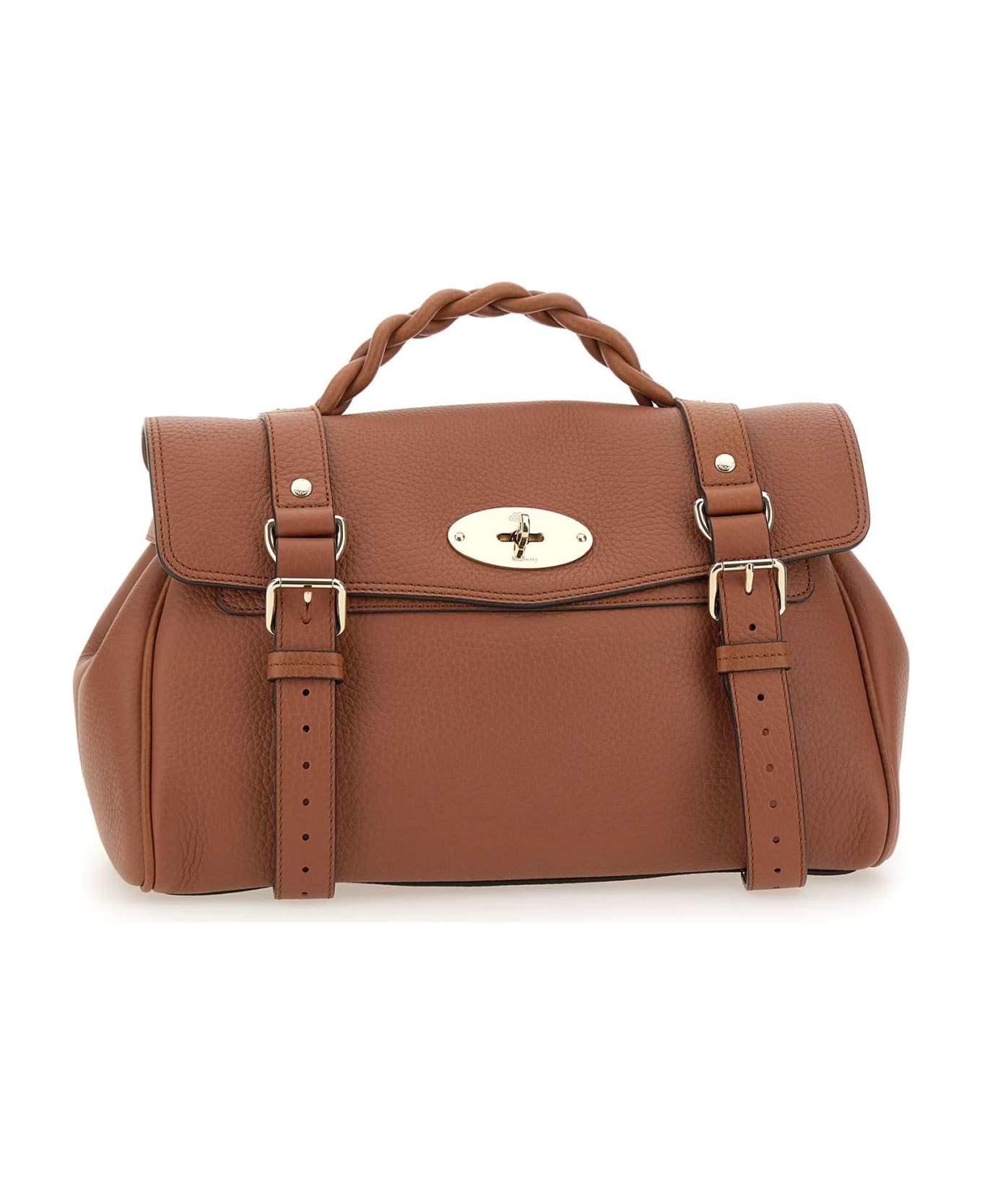 Mulberry Alexa Heavy Grain leather handbag tumbled effect, cognac, top weaving handle, postman padlock fastening with swivel mechanism and buckles with buttons, embossed logo, adjustable and removable shoulder strap, shiny gold finishes, one main compartment , internal slip pocket, unlined inside. Dimensions: height 20cm, depth 16cm, length 30cm. Shoulder strap length 104cm. Composition: 100% Leather,