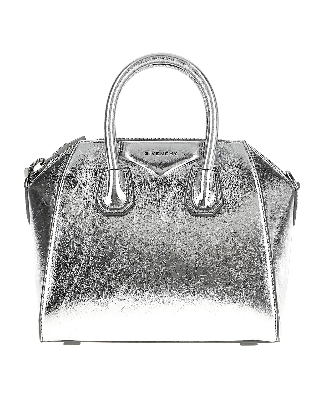 'Antigona' laminated leather mini handbag with zip closure, double handle, adjustable and removable shoulder strap, front embossed logo.