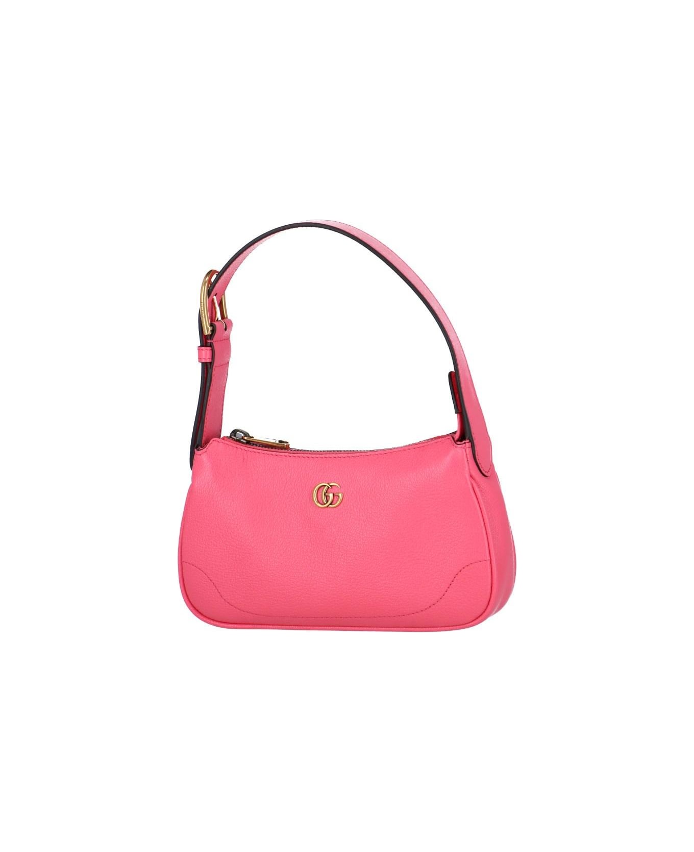 Gucci Aphrodite mini shoulder bag in pink hammered leather, adjustable top handle, zipper closure, gold logo on the front, and main interior compartment.