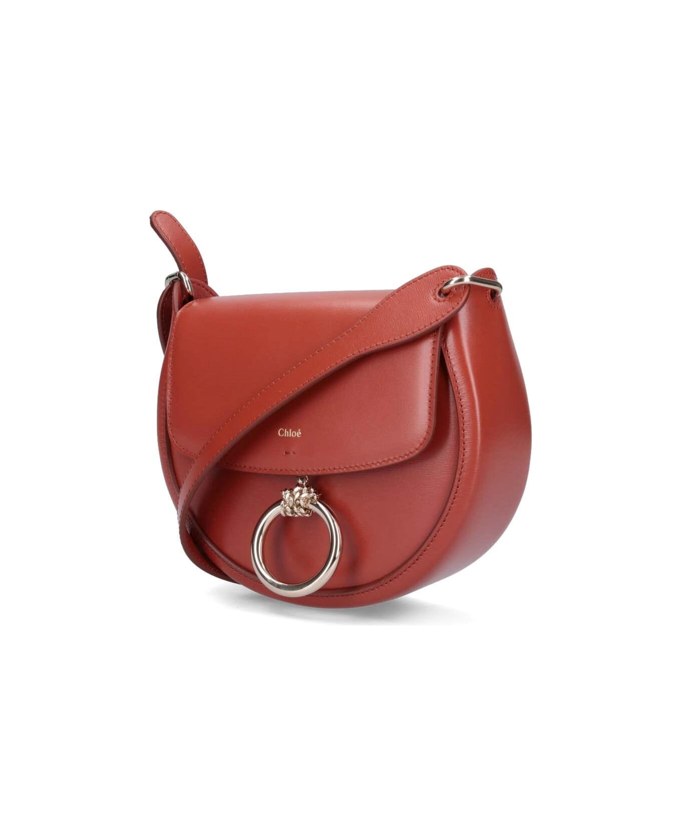 Chlo A' small crossbody bag in brown leather with adjustable shoulder strap, a magnetic closure, a gold logo print at the front, a gold metal ring charm at the front, an inner zip pocket, a main inner compartment.