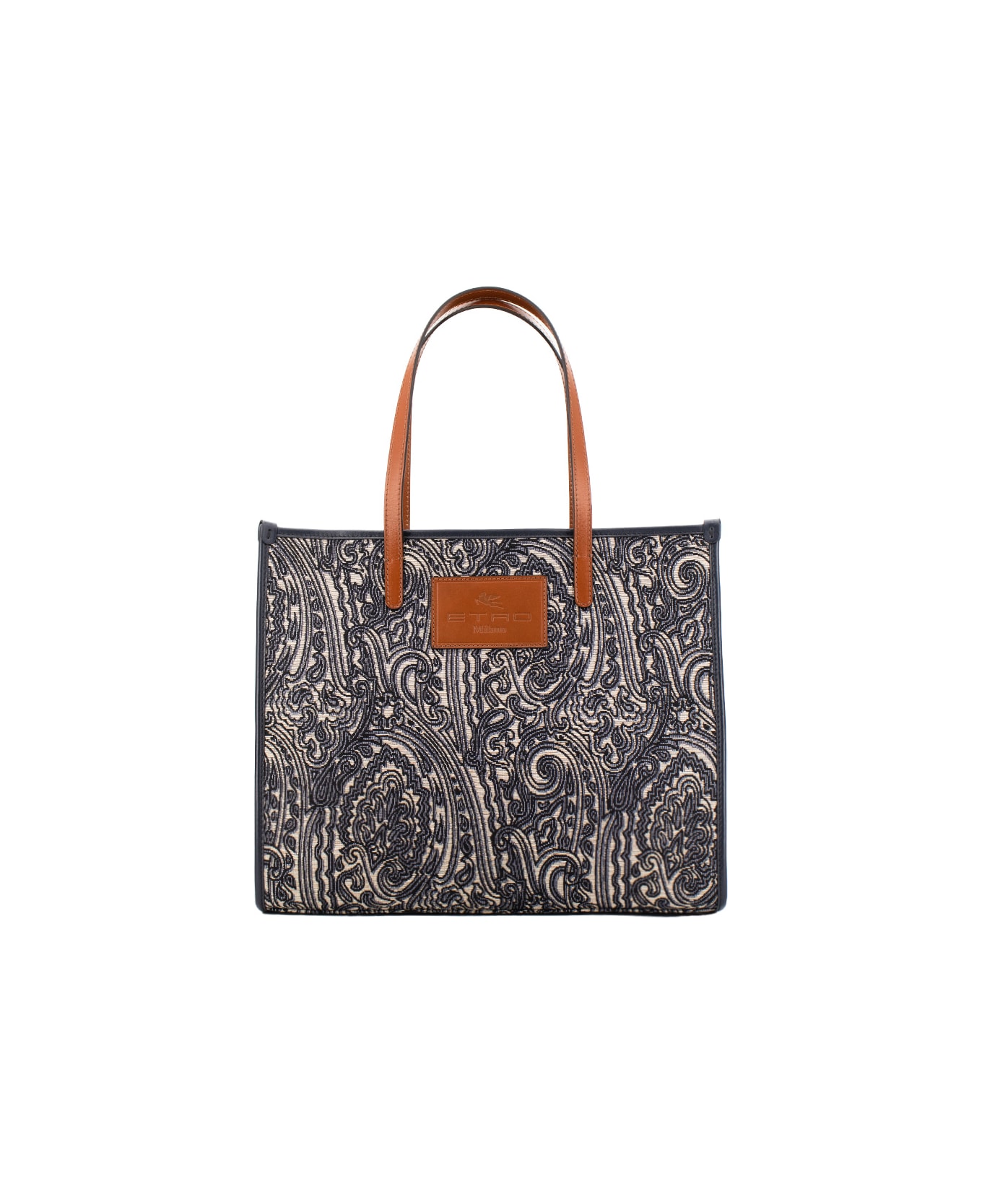 Medium sized shopping bag made of jacquard fabric with leather details that reinterprets the Maison's iconic Paisley pattern in a graphic style, on the front is an ETRO logo label with embossed Pegasus, inside pocket with zip. Dimensions: 37. 5 x 31. 5 x 15 cm.
