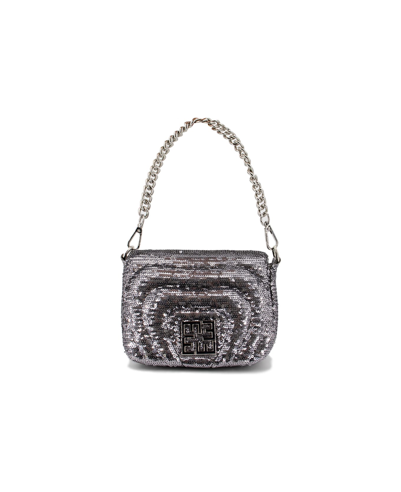 The ideal accessory to complete the most glamorous looks, the new small bag made shiny by the applied sequins, two removable metal straps, magnet closure, metal logo on the front, dimensions: 17x13x17 cm.