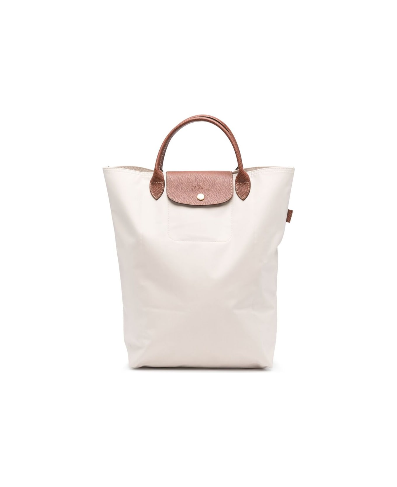 beige/brown canvas two top handles main compartment internal slip pocket gold-tone hardware front flap closure with logo debossed press-stud fastening