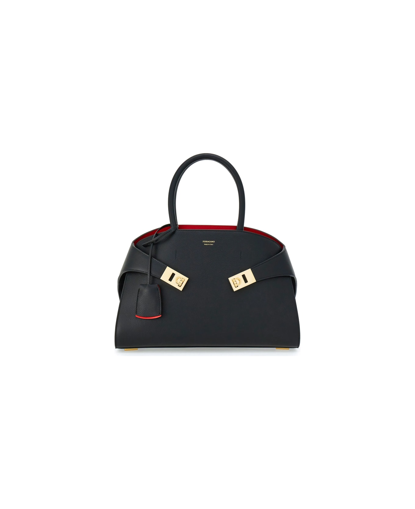black calf leather Gancini plaque gold-tone logo lettering gold-tone hardware leather tag circular top handles adjustable detachable shoulder strap metal feet main compartment