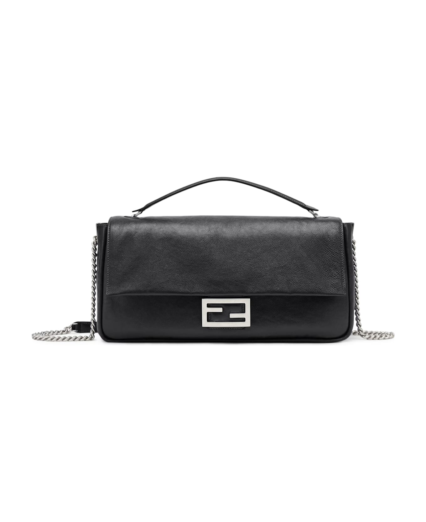 -Iconic Baguette Bag Large with Chain, characterized by a soft oversized construction. -Made of calfskin with a semi-gloss finish in black. Decorated with FF closure. -Featuring a front flap, magnetic button closure, an internal compartment lined in brown suede and with a zip pocket, palladium-finish metal accessories. -Can be carried on the shoulder or cross-body thanks to the sliding chain shoulder strap. -Height: 21 cm