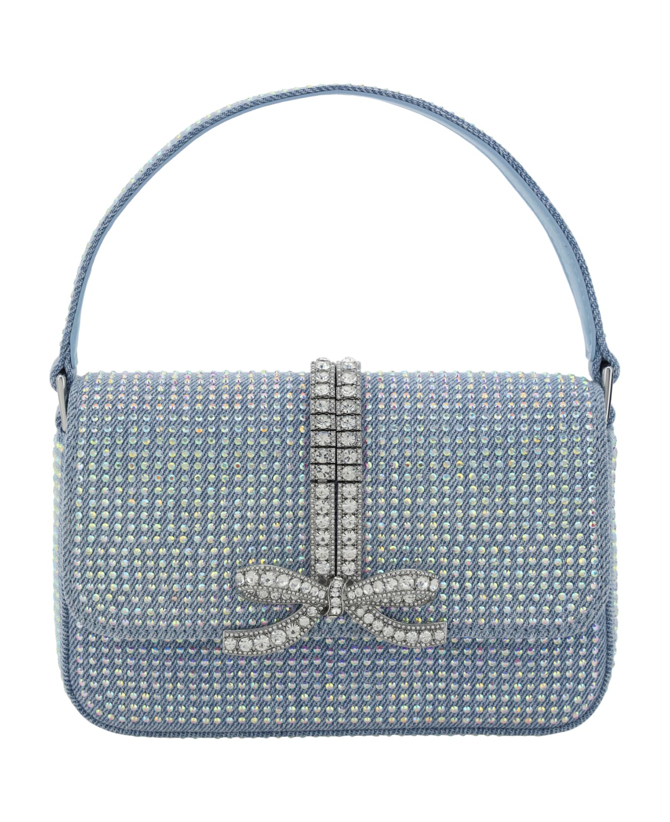 Baguette handbag by self-portarit, design embellished with all-over applied shiny rhinestones and jewels, single rigid leather top handle, matching and applied embossed bow on front, soft viscose lining, removable metal chain shoulder strap.