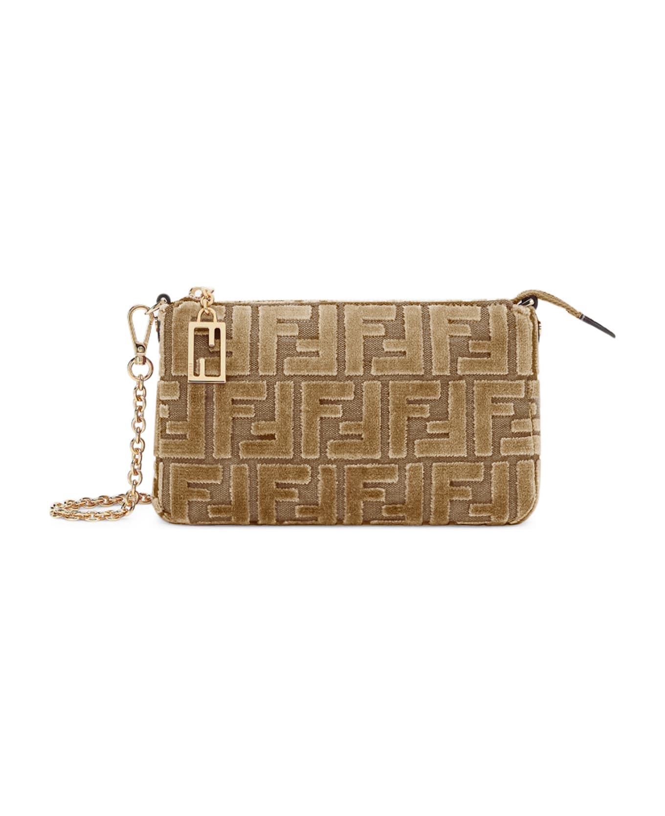 -Baguette Pouch made of jacquard velvet with embossed FF motif in cappuccino color on a beige base -Zip closure and zip pull with iconic FF motif -Lined interior, pocket with card holder slot in light blue calfskin and gold-finish metal accessories -Can be carried by hand, under the arm or cross-body thanks to the short shoulder strap in thin chain and the long shoulder strap in calfskin, both removable -Can hold a 6. 7-inch smartphone and keys -The card holder is integrated inside the bag -Height: 13 cm -Depth: 3 cm -Width: 20 cm -Weight: 0. 19 kg -Shoulder strap drop: 13 cm