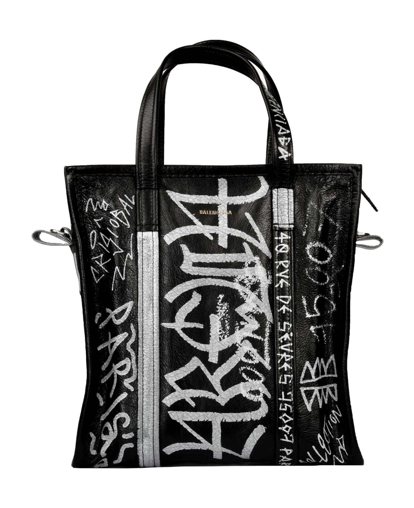 Bazar S Graffiti Shopper Bag from Balenciaga: Black/White Bazar S Graffiti Shopper Bag with top handles, removable shoulder strap, internal zipped pocket, main internal compartment and top zip closure Composition: 100% Lamb Skin