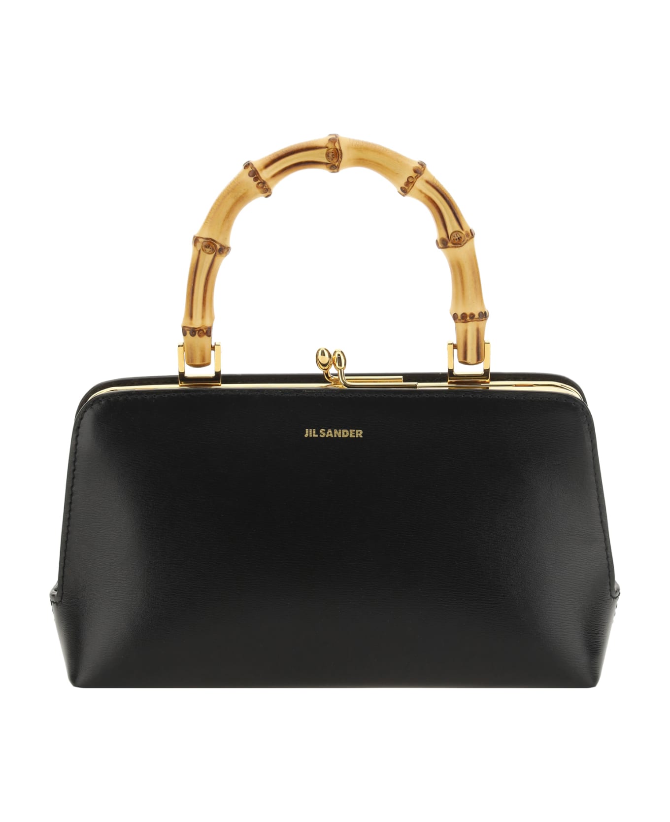 Calfskin bamboo handbag by jil sander, rigid bamboo handle at top, removable and adjustable thin leather shoulder strap, snap top closure, iconic brand monogram press-stamped on front, geometric design. Composition: 100% % Calf Leather Bos Taurus