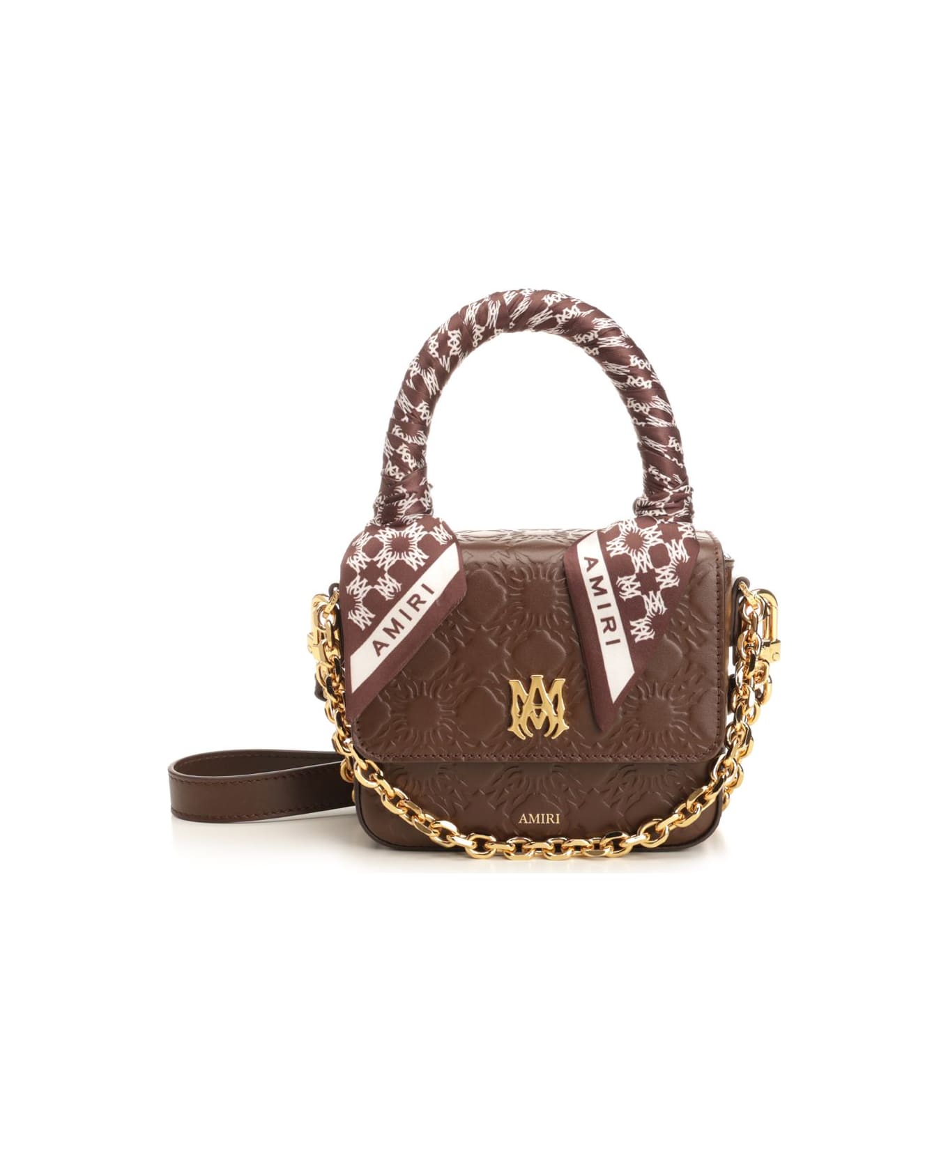 "Bandana Micro MA" handbag from Amiri made of chocolate embossed leather, featuring a magnetic closure, gold hardware with MA icon on the front, a top handle with a knotted bandana and an adjustable and removable shoulder strap. One main compartment and two flat pockets.