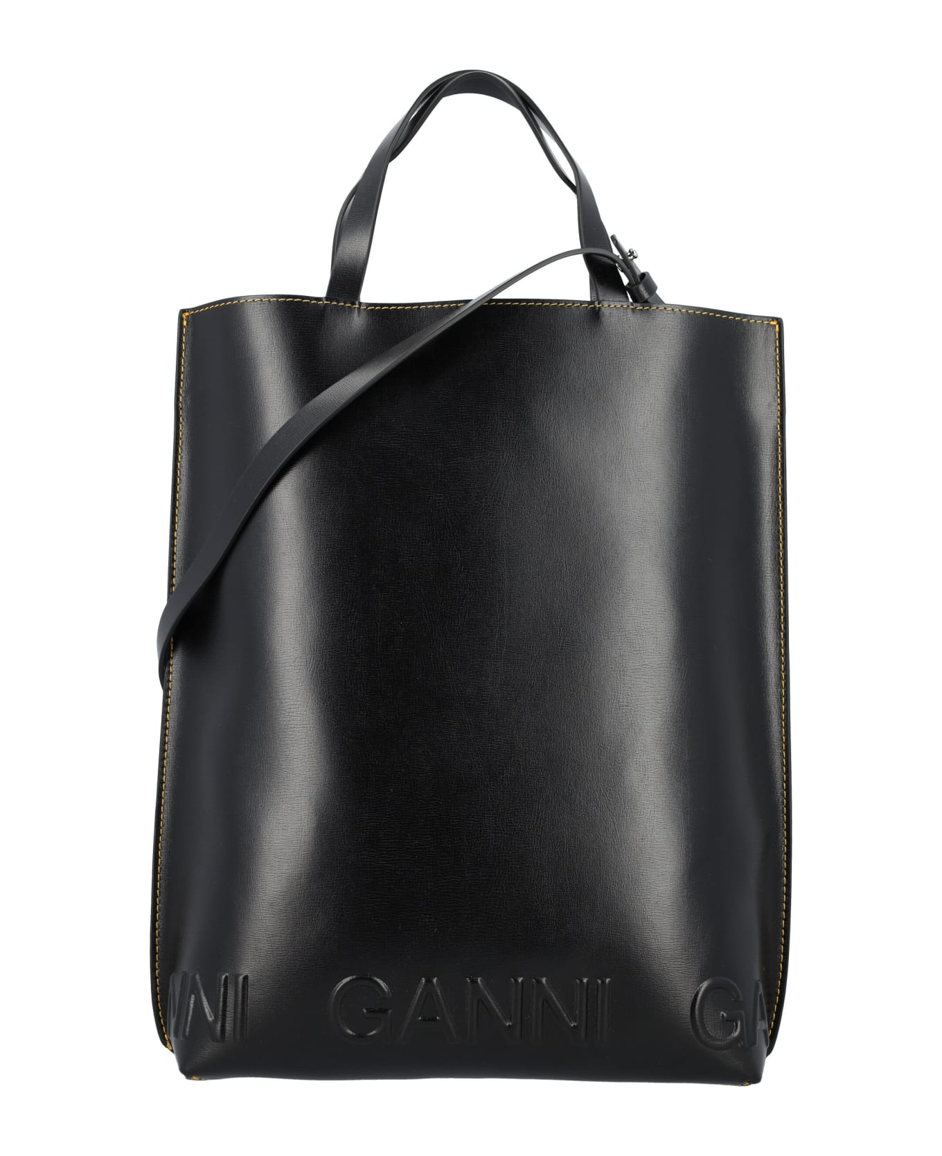Banner Medium Tote By Ganni. Featuring: Open Top With A Snap Button Closure Double Handle Removable Strap Embossed Logo Lettering Detail At The Front Yellow Stitching Main Compartment Inside Zip Pocket Height: 34cm Width: 28cm Depth: 9,5cm