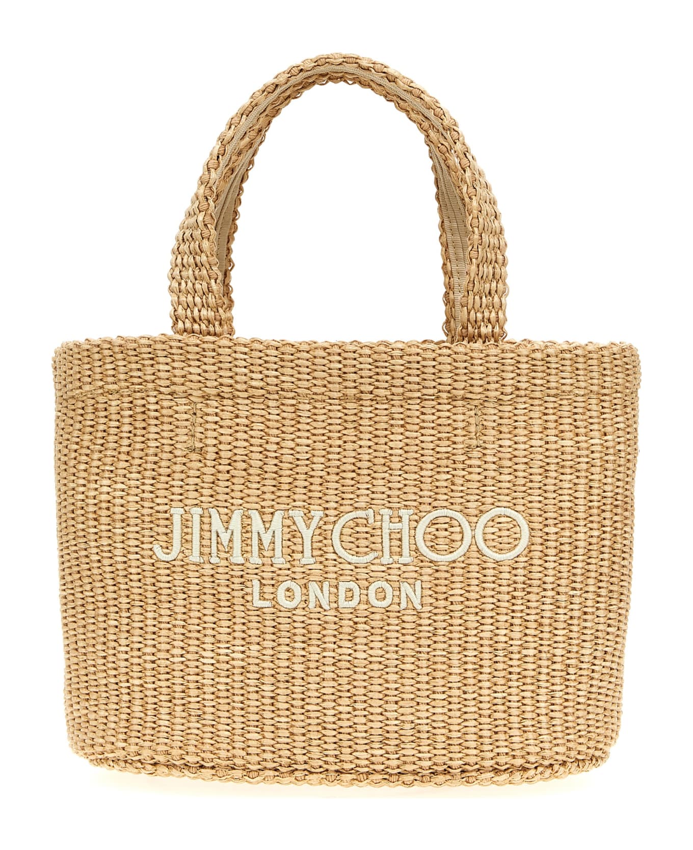 'Beach Tote E/W Mini' raffia handbag with front logo embroidery, double handle, removable leather shoulder strap. Composition: 100% fabric