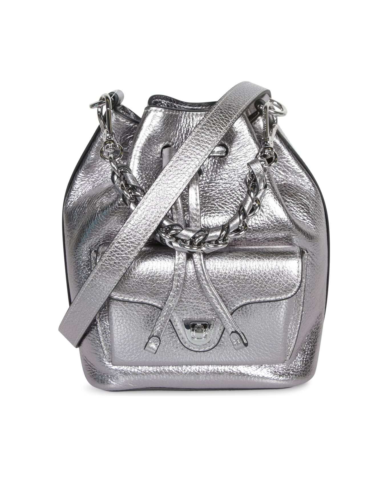 This chic Coccinelle bucket bag showcases a shimmering silver color with metallic silver trims, creating a sophisticated yet versatile look for any occasion.
