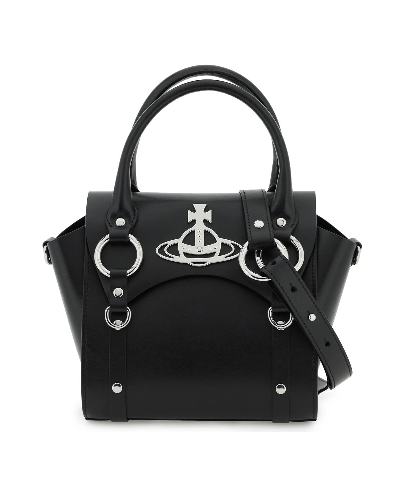 Leather "Betty" handbag by Vivienne Westwood with a rigid design and characterized by the iconic silver metal Orb. Double handle, magnetic closure, leather interior with a zippered pocket and adjustable, detachable shoudler strap. Silver-finished metalware.