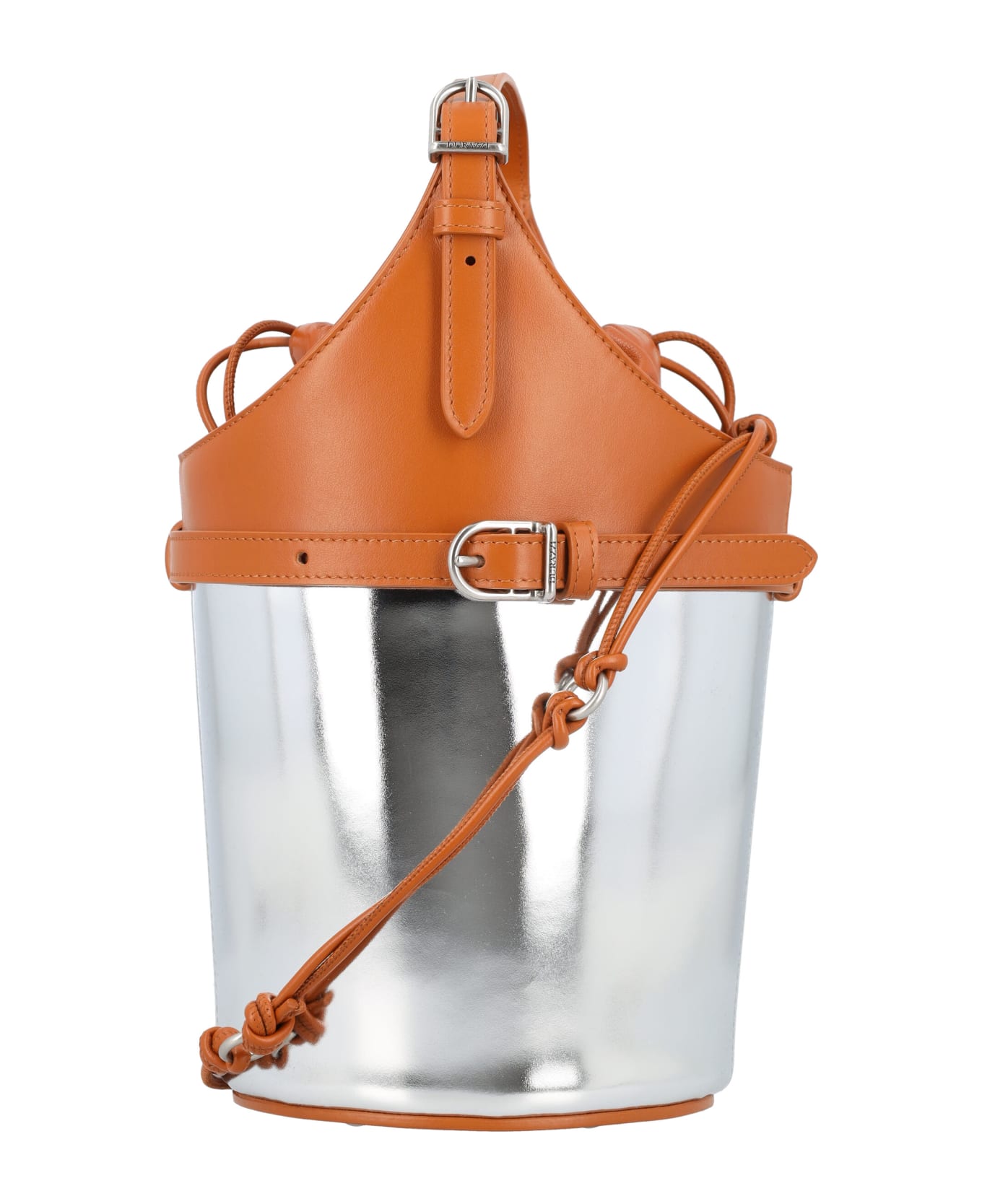Leather Bicolor Bucket Bag By Durazzi Milano. Featuring: Srawstring Closure Top Handle Adjustable Knotted Shoulder Strap Rigid Bottom Width: 14 Cm Height: 19 Cm Depth: 14 Cm