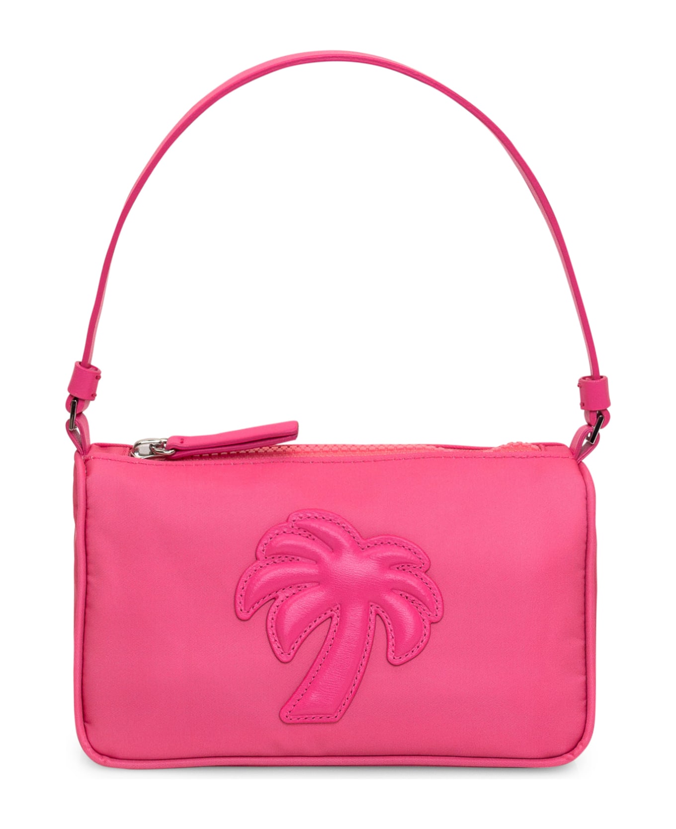 Pink bag. One handle. Zip closure. Palm patch on the front.