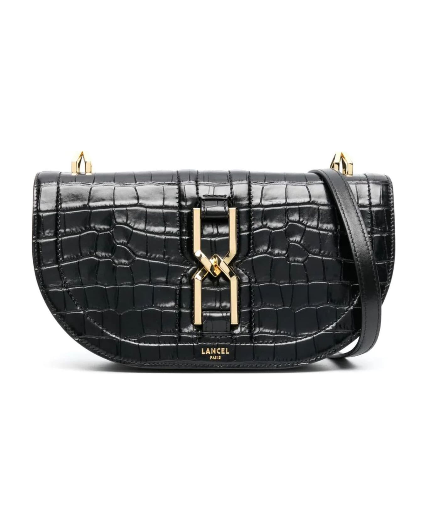 Black Clepsydre crossbody bag, calf leather, embossed crocodile effect, logo stamp to the front, gold-tone hardware, foldover top with magnetic fastening, adjustable detachable shoulder strap, internal logo patch, internal zip-fastening pocket, partitioned compartment, height 15 cm, strap 54 cm, width 27 cm