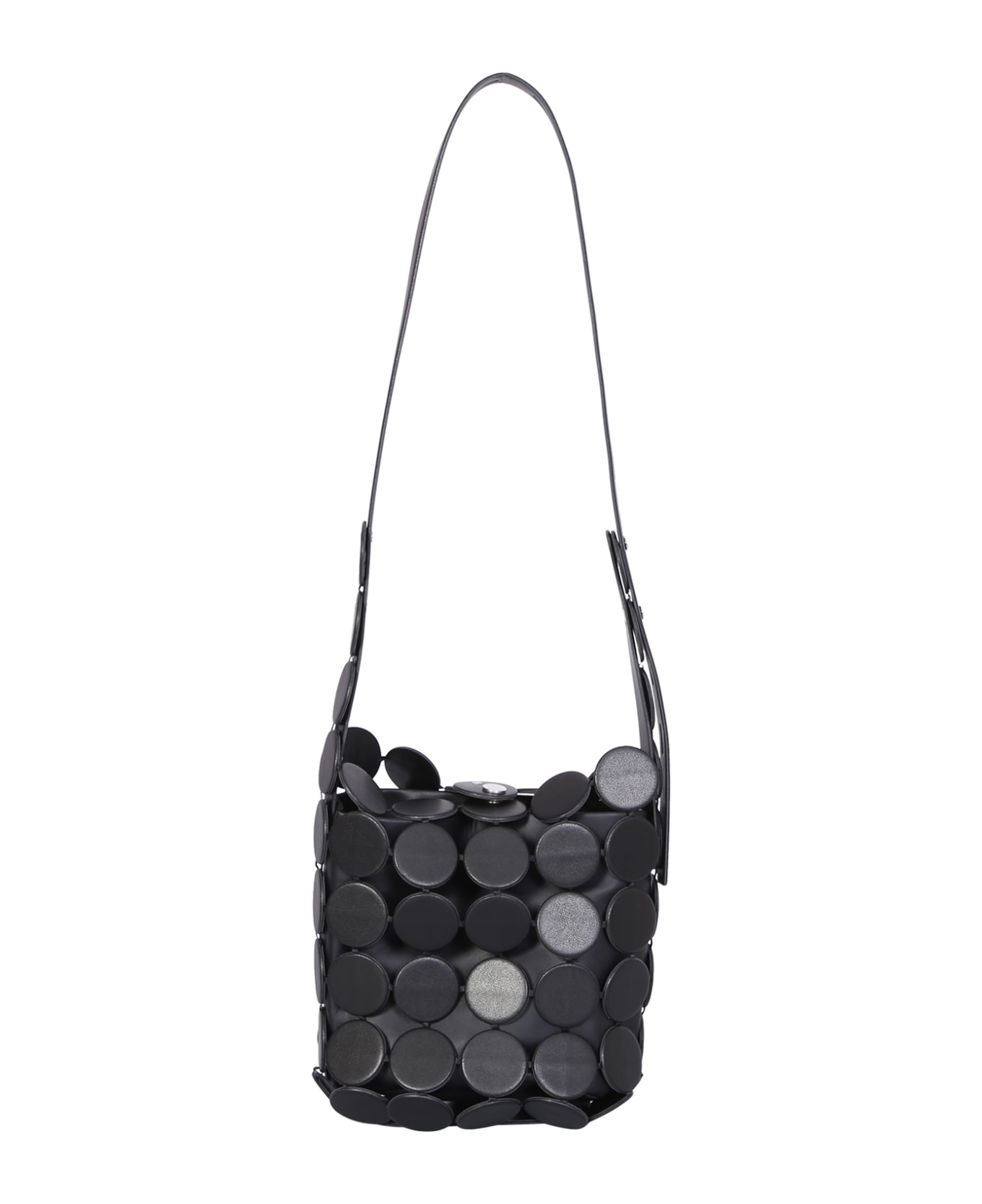 Top press stud fastening. Single shoulder strap. Main compartment. Internal logo patch. Cut out detailing. Color: black