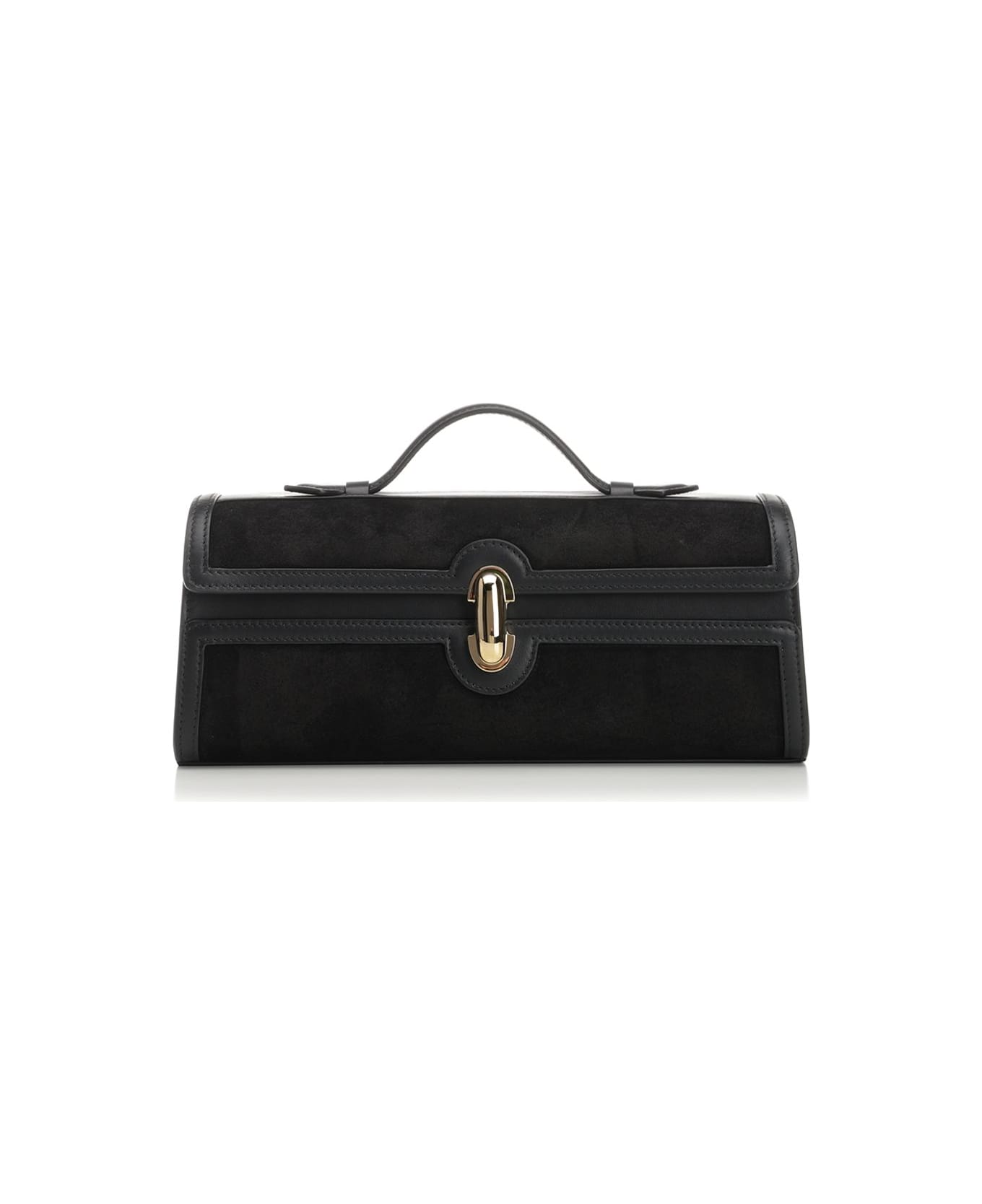"Slim Symmetry" clutch in black suede with black leather trim by Savette. Snap closure. Leather handle.