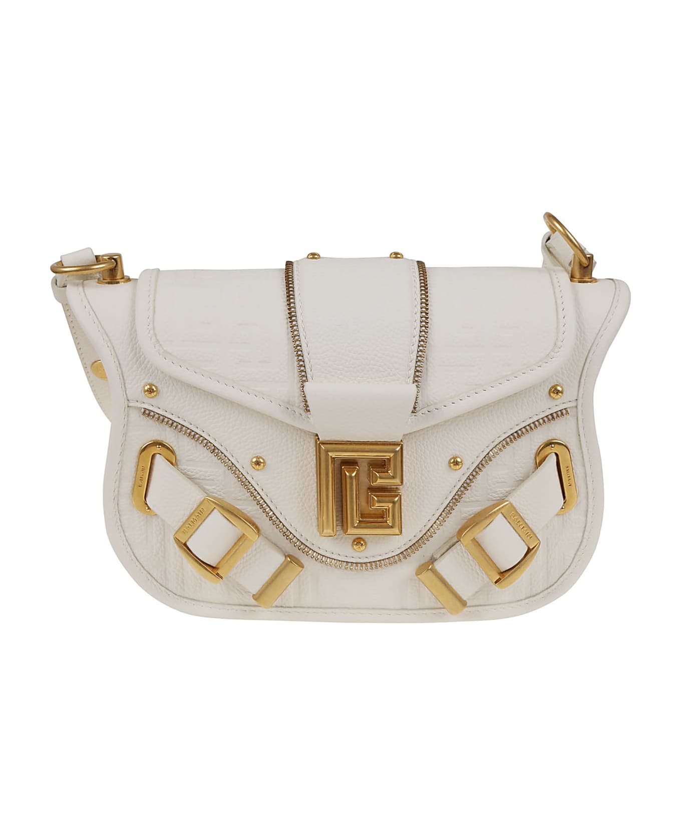 Blaze bag in grained calfskin BY BALMAIN. Flap with magnetic monogram closure; inside patch pocket, zip pocket and card holder pocket with golden embossed logo inside. Embossed logo and patch pocket on the back. Removable shoulder strap with Balmain engraved carabiners. Protective case included.