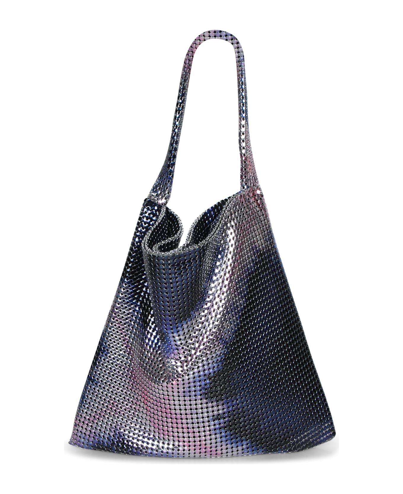 This exclusive Paco Rabanne Cabas bag merges modern aesthetics with an artistic touch, showcasing a blue tie-dye fusion on micro metallic mesh that catches the light with every move.