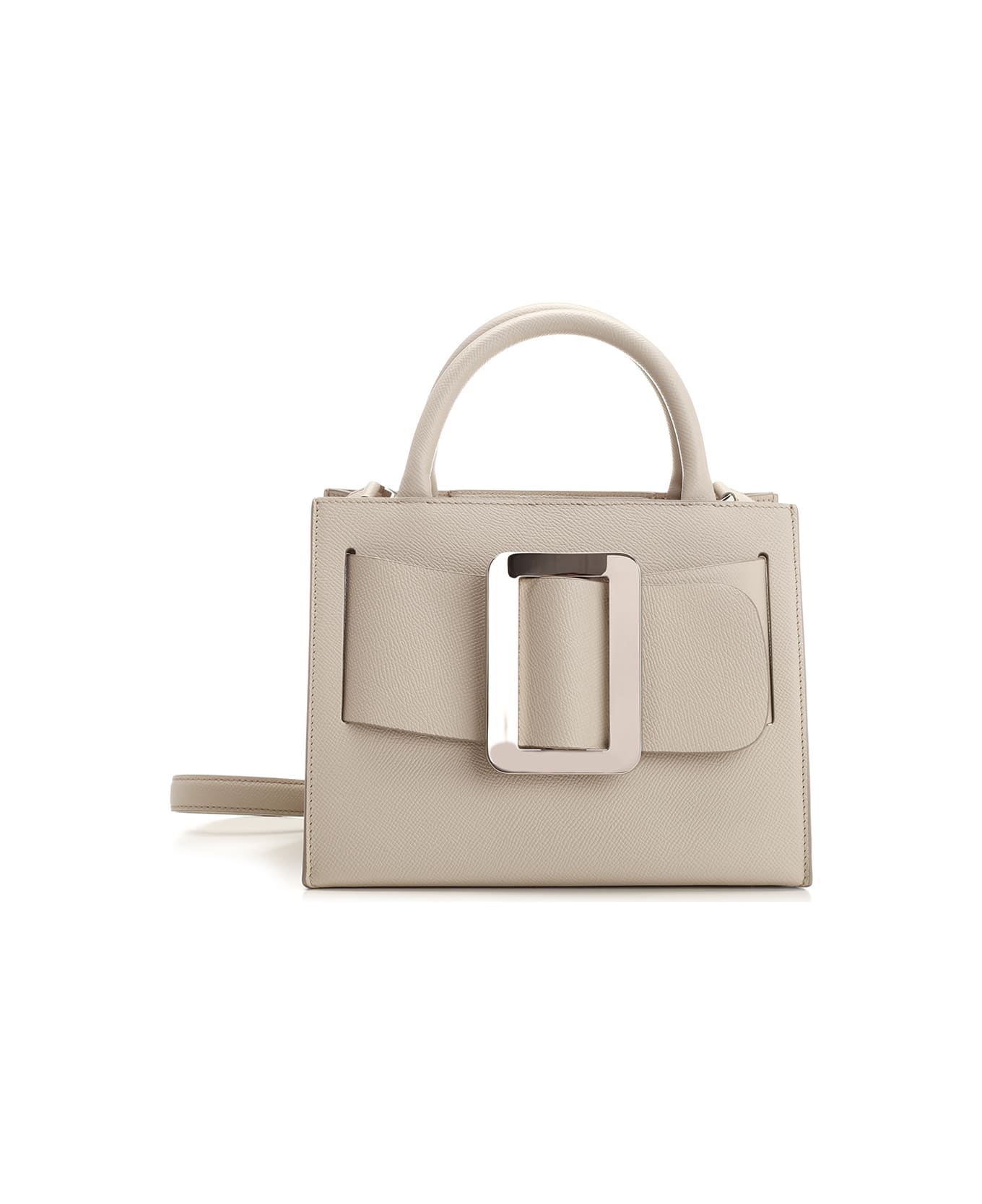 "Bobby 23" medium size handbag from Boyy featuring a rigid structure in oat beige leather, with suede interior, belt with oversized buckle symbol of the brand, internal snap closure, internal pocket with zip and pochette, metal feet at the base, adjustable and detachable leather shoulder strap.