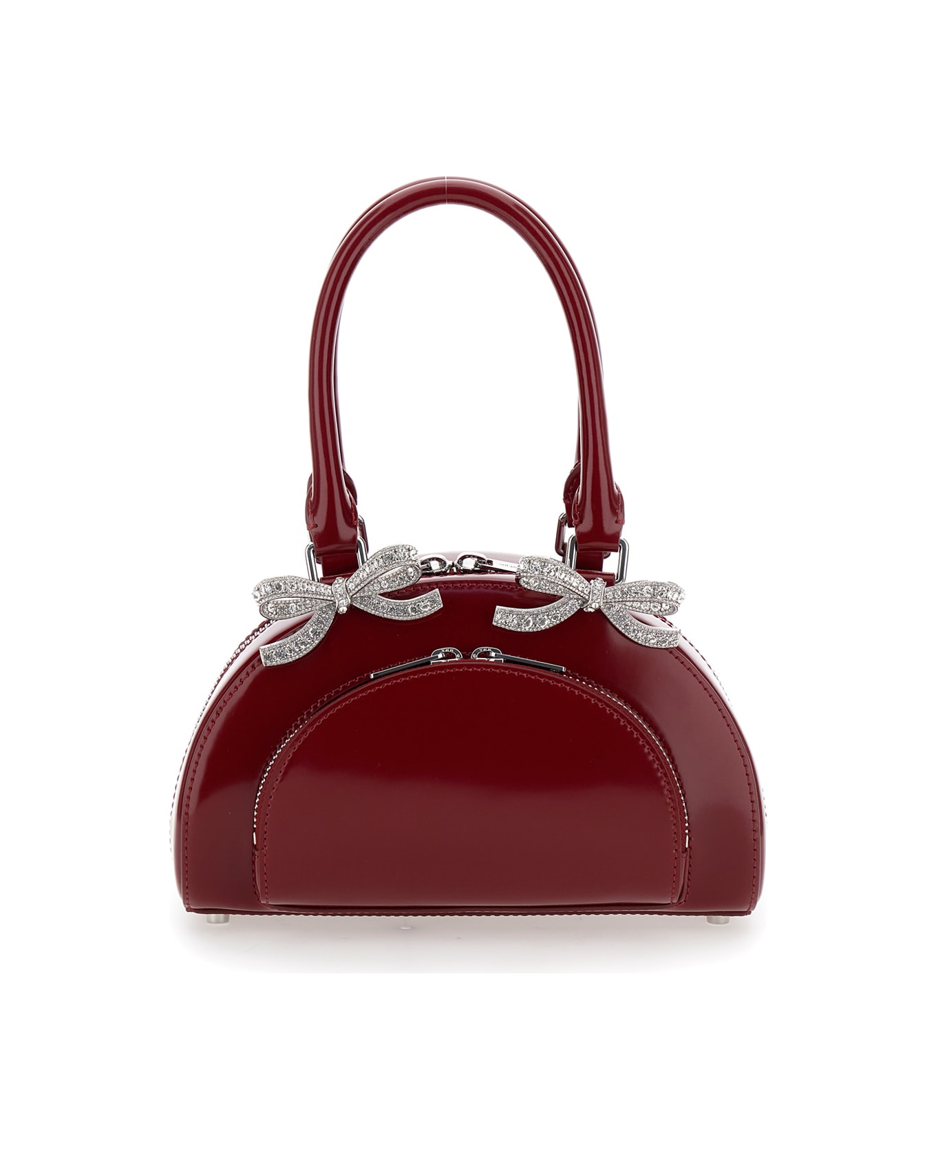 Handbag Bordeaux Two top handles Two way zip closure Crystal bows embellishment One front zipped pocket Silver tone metalware Patent leather Dimensions: 21x7x13 cm Handle drop: 14 cm
