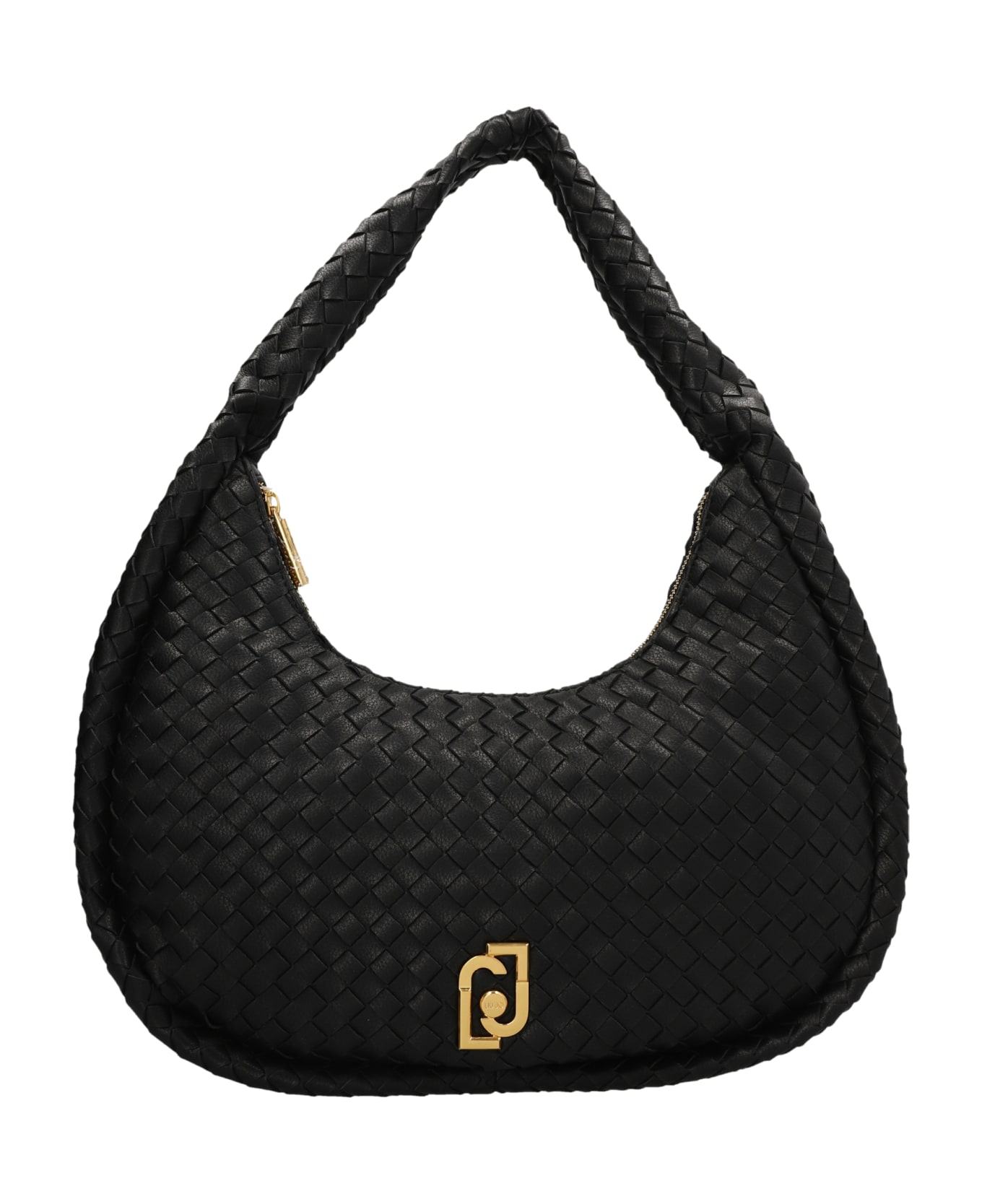 Woven PU shoulder bag, with a handle, an inner zipper pocket, a front metal logo, and a zipper closure.