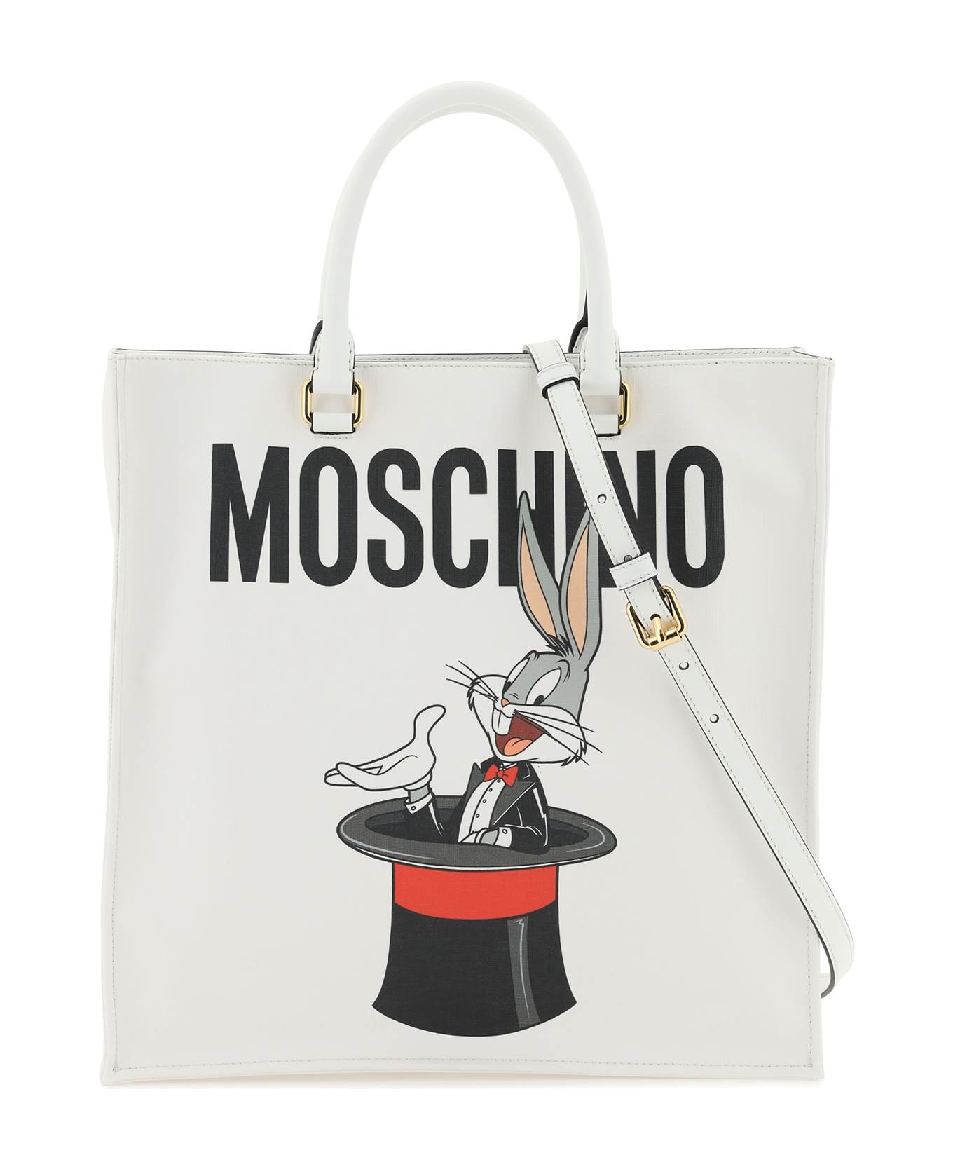 MOSCHINO tote bag crafted in coated canvas with contrasting lettering logo and Bugs Bunny print. Double handles, fabric interior with one zippered pocket, one credit card slot and two open utility pockets. Adjustable and detachable shoulder strap and gold-finished metalware.
