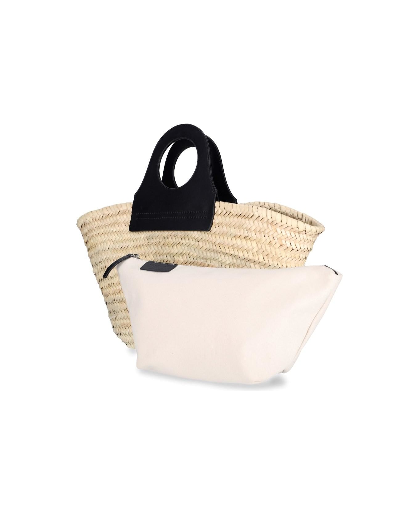 Hereu Caba beige raffia tote bag with black leather handles, inner strap closure, removable inner pouch. 100% raffia trims: 100% leather